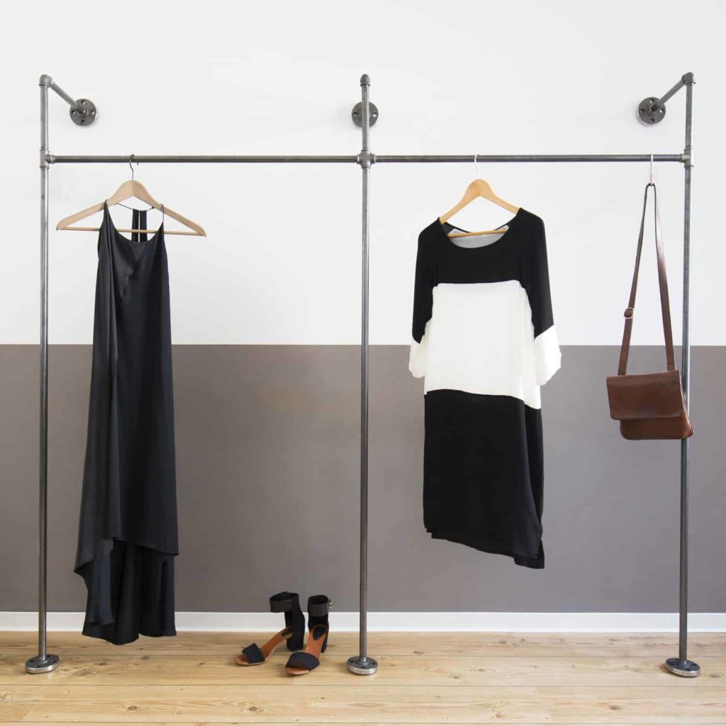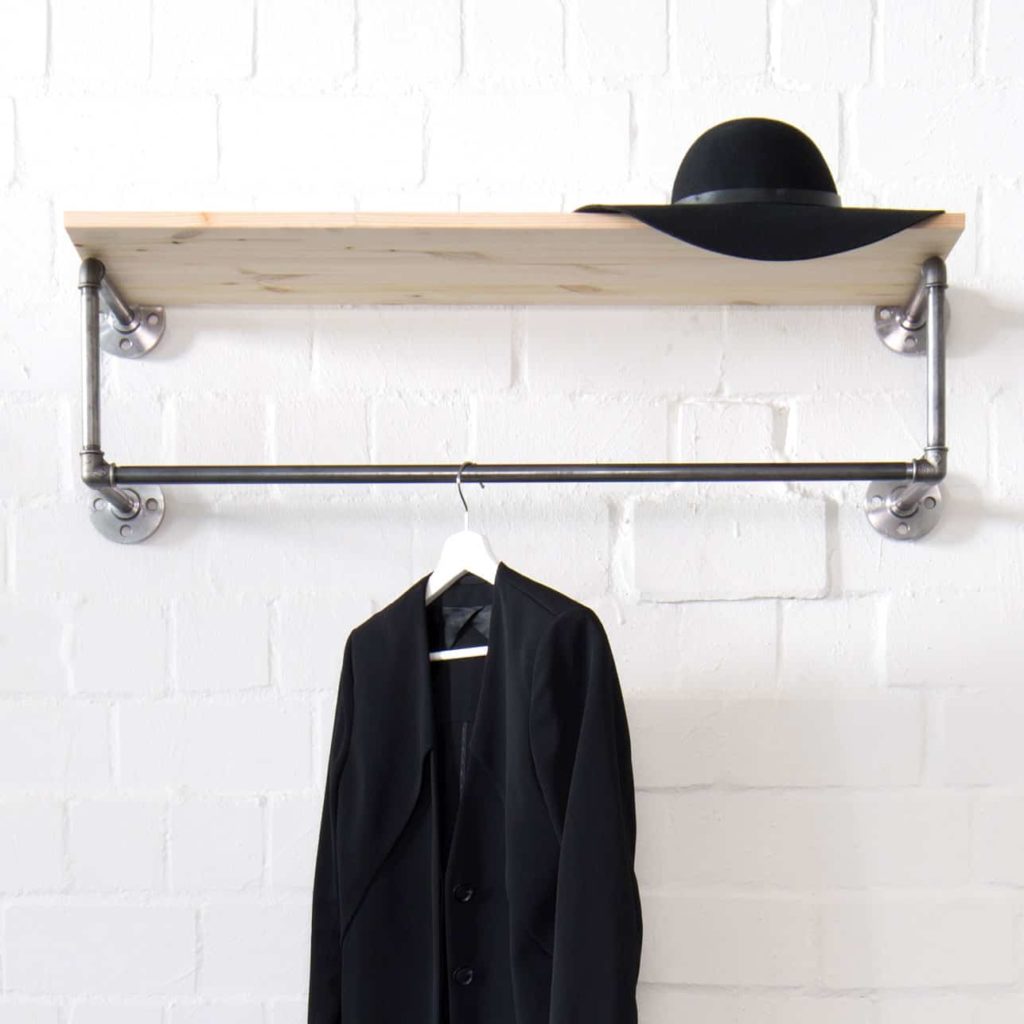 Kleiderstangen aus Rohren lassen sich schnell an die Wand montieren. Die Kleiderstange kann entweder aus einem langen oder kurzen Wasserrohr auf einer Ebene oder über zwei Ebenen konstruiert werden. Die obere Ebene kann zudem durch ein Brett erweitert werden und als Ablage für Kleidungsstücke, Spiele oder ähnliches genutzt werden.