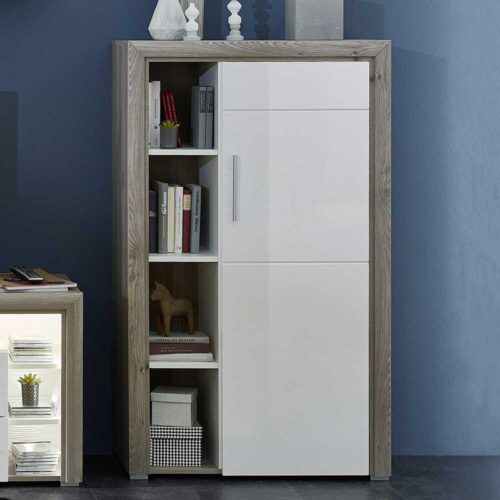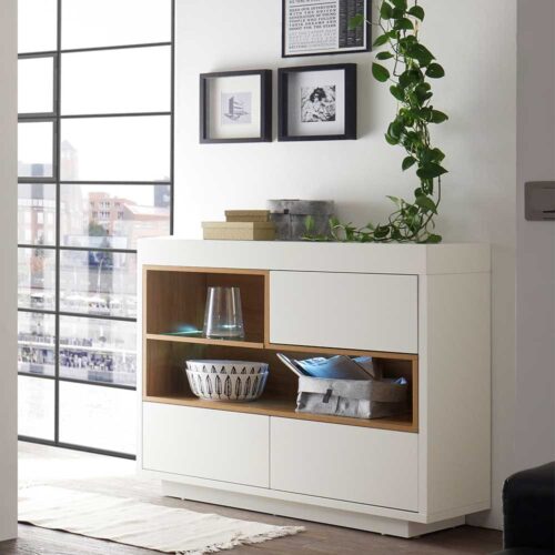 Wohnzimmer Kommode in Hochglanz Weiß und Dekor Eiche