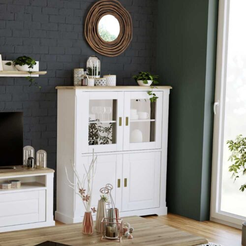 Highboard Vitrine im Landhaus Design Weiß mit Eiche