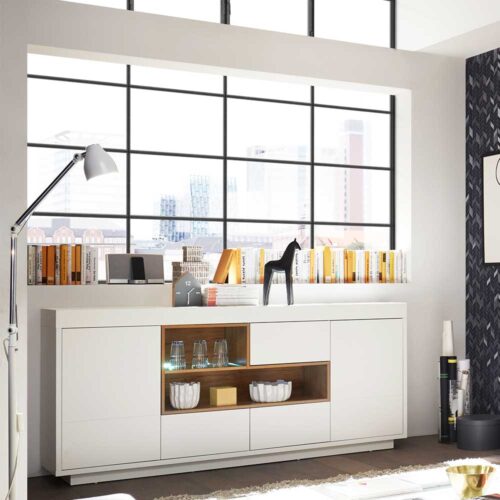 Design Anrichte in Weiß und Eichefarben offenen Fächern