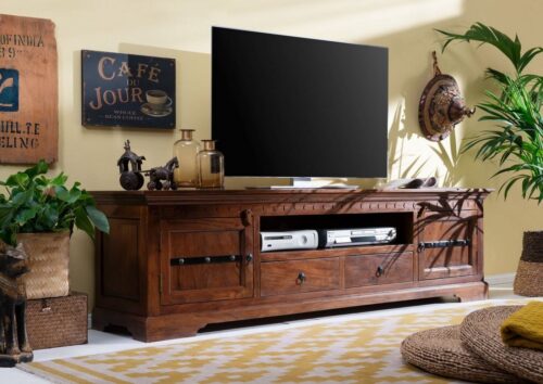 • Massivmoebel24 Drehtürenschrank »OXFORD« (97x50x176 Akazie montiert, Schrank Wohnzimmer aus Akazienholz mit Schnitzereien im Landhausstil) hochwertiges Edelholz, authentische Holzadern, aufwendige Schnitzereien und Verzierungen, detailreich und stilvoll