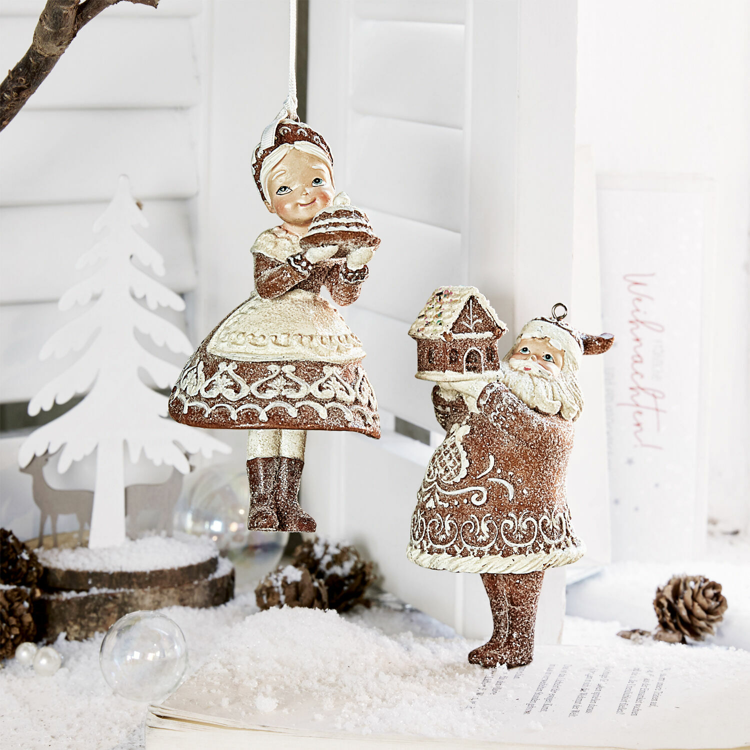 Oft sind es die kleinen Dinge, die uns große Freude schenken. Eine schöne Blume am Wegrand, das Lächeln eines freundlichen Menschen im Vorübergehen – oder die vielen hübschen Dinge, die mit dem Begriff Dekoration eigentlich viel zu oberflächlich zusammengefasst werden. Zu diesen feinen Sachen, die wir gerne ansehen, gehört zweifellos dieses wunderbare Duo, das bis in die feinsten Details liebevoll ausgestaltet wurde. Weihnachtsfrau und Weihnachtsmann kommen als Einheit zu Ihnen und präsentieren in ihren kleinen Händen jeweils ein Lebkuchenhäuschen. Für den winterlichen Schneeeffekt auf der Kleidung sorgt ein feines Zuckerfinish. Das letzte i-Tüpfelchen dieser schönen Dekofiguren bildet die Kunstseidenkordel, mit der Sie die Figuren beispielsweise an Ihren Christbaum oder an schöne weihnachtliche Zweige in einer Vase hängen können.
