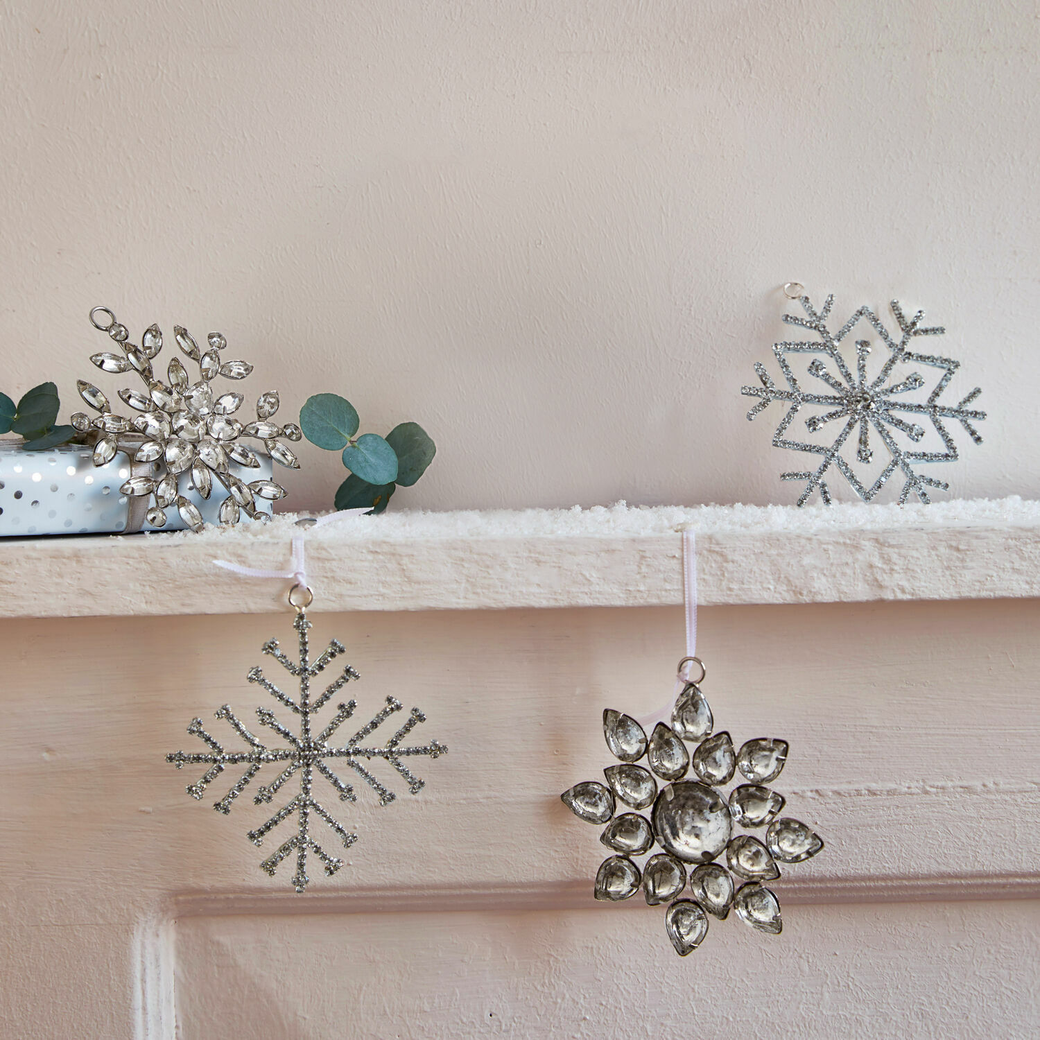 Vier glitzernde Kleinode finden sich in diesem Set, das zu jeder gut sortierten Weihnachtsdekoration gehört. Die Schmuckstücke entstehen durch feine Glassteine, die auf dünnem Metall aufgebracht wurden. Die Motive, die sie bilden, könnten weihnachtlicher nicht sein: Ganz leicht und spielerisch verschmelzen sie die Formen von Sternen und Schneeflocken miteinander. Ihren rechten Platz finden die ästhetischen Schmuckstücke natürlich an Ihrem Christbaum, aber beispielsweise auch an hübschen Zweigen in Vasen oder an Kränzen. Auch gelegt auf dem Esstisch oder in eine Schale mit weitere Deko sind die Anhänger von reizvoller und bezaubernder Wirkung. Machen Sie mit diesen Sternen Ihr Haus zu einem Refugium der Festlichkeit und Schönheit, das Ihre Gäste staunen lässt, wenn sie es betreten.