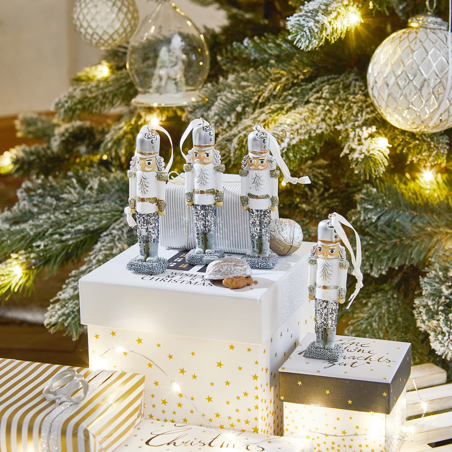 Funkelnde Freude an der Tanne: Diese vier hübschen Nussknacker glitzern edel im Schein der Kerzen. Freuen Sie sich diese Weihnachten über vier stilechte Deko-Figuren, die an die Feste vergangener Zeiten erinnern – herrlich nostalgisch zum Shabby-Chic. Die vier kleinen Nussknacker sind von Hand bemalt und mit vielen feinen Details versehen. Eine Aufhängung ist schon inklusive. Sie erinnern an geliebte Erbstücke, die man vielleicht von der Großmutter erhalten hat. Kleine Sammlerstückchen, die alle Jahre wieder für Besinnlichkeit, Freude und einen individuell geschmückten Weihnachtsbaum sorgen. Frohe Festtage!
