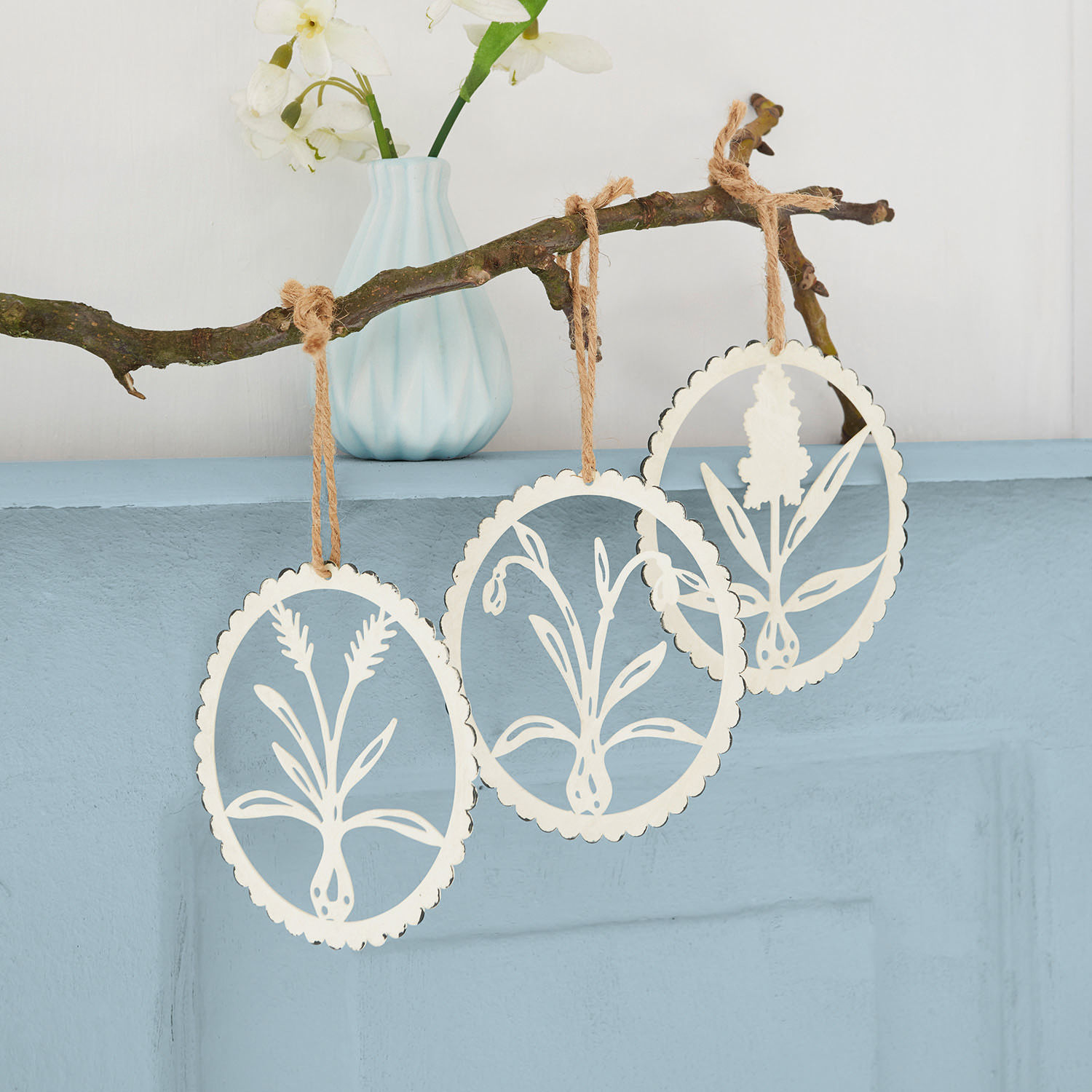 Sechs filigrane Kunstwerke aus Eisen bezaubern mit zarten, floralen Motiven. Ein Band aus Jute ist schon angebracht, sodass Sie damit gleich Ihr Heim verschönern können. Das Set hat einen nostalgischen Charakter, welcher sich wunderbar zum Shabby-Chic macht. Verzieren Sie mit den leichten Anhängern vielleicht Zweige in einer Vase oder bringen Sie sie an einer Hakenleiste an – hier sind der Kreativität keine Grenzen gesetzt. Auch als Zierde am Fenster machen die stilvollen Scherenschnitt-Motive sich sehr gut. Freuen Sie sich auf ein stimmungsvolles und zeitloses Design, an dem Sie lange Jahre Freude haben können.