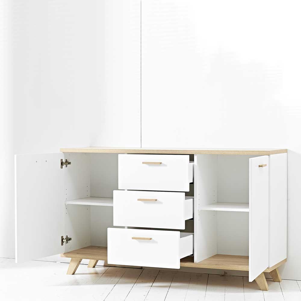– Sideboard Weiß und Eichefarben – Wohnzimmerschrank MDF und Spanplatte – Kommode Modern – Sidebord Breite: 144 – Küchenkommode Höhe: 87 – Wohnzimmer schrank Tiefe: 40 – Wohnzimmer kommode Mit drei Schubladen, mit Selbsteinzug und mit Metallauszug – Große kommode Schrank-Tür: mit Drehtüren – Esszimmer kommode 2-türig (mit Türdämpfung), Innenaufteilung: mit Einlegeböden – Wohnzimmerkommode Ohne Beleuchtung – Esszimmerkommode Zerlegt, zum leichten Selbstaufbau (Montageanleitung liegt bei) – Esszimmersideboard Deutsche Produktion – Küchensideboard Melaminbeschichtet – Schubladensideboard Holzgriffen – Eichenkommode Mit stoßfesten ABS Kanten – Rechteckige FormInformationen zur Lieferung:Die Zustellung dieses Produktes erfolgt per Spedition. Sie werden vor der Auslieferung durch die ausliefernde Spedition kontaktiert.Terminvereinbarung: Sie werden frühzeitig (ein paar Tage im Voraus) durch die ausliefernde Spedition kontaktiert und Ihnen der Auslieferzeitpunkt mitgeteilt. Die Kontaktaufnahme erfolgt per Telefon. Bei telefonischer Nichterreichbarkeit werden Sie per Postkarte über das Auslieferdatum informiert.Die Lieferung erfolgt aus Kostengründen Frei Bordsteinkante (bis zur ersten verschlossenen Tür). Für den weiteren Transport der Ware sind Sie eigenverantwortlich.Die Auslieferung erfolgt von Montags bis Freitags. Eine Zustellung an Sonn- und Feiertagen ist nicht möglich.