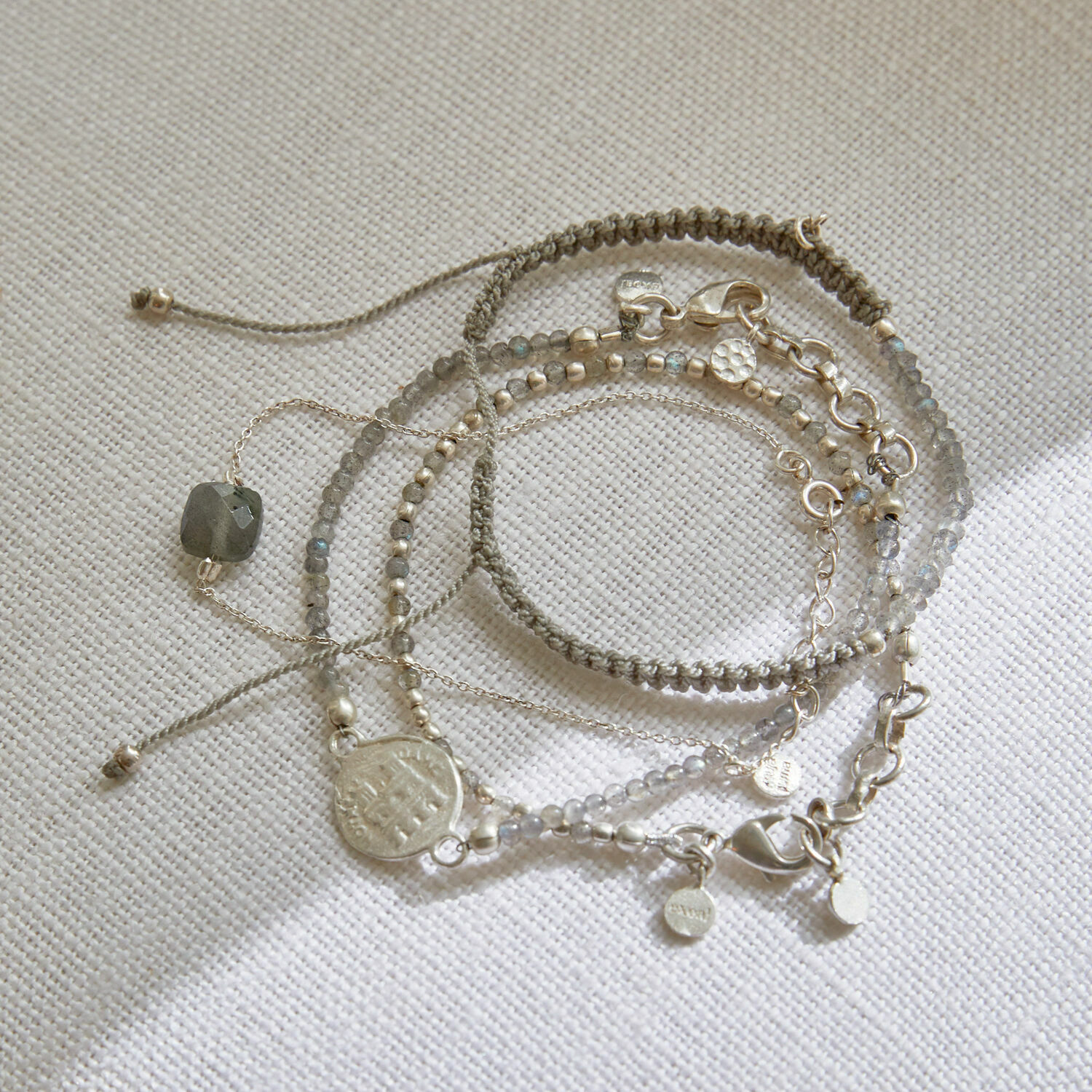 Freuen Sie sich auf ein sehr modisches und elegantes Schmuck-Quartett. Die vier Armbänder sind mit edlen Labradorit-Steinen geschmückt, welche von Hand geformt und geschliffen sind. Die Steine schimmern irisierend und erinnern mit ihrem schönen Glanz an Perlmutt. Dazu gesellen sich schmückende Applikationen aus Echtsilber, die zusätzlichen Charme ergeben. Die Armbänder sind flexibel dehnbar, sodass sie garantiert passen und sich bequem tragen lassen. Man sagt dem Labradorit viele positive Eigenschaften nach: Der dekorative Stein soll die Kreativität und Phantasie steigern, die Erinnerung und Zielgenauigkeit im Leben verbessern, die Knochen stärken und auch beruhigend wirken. In jedem Fall schmeicheln diese vier detailreichen Schmuckstücke Ihrer Garderobe und passen zu vielen Anlässen. Sie sind auch eine sehr gute Geschenkidee für liebe Freundinnen.