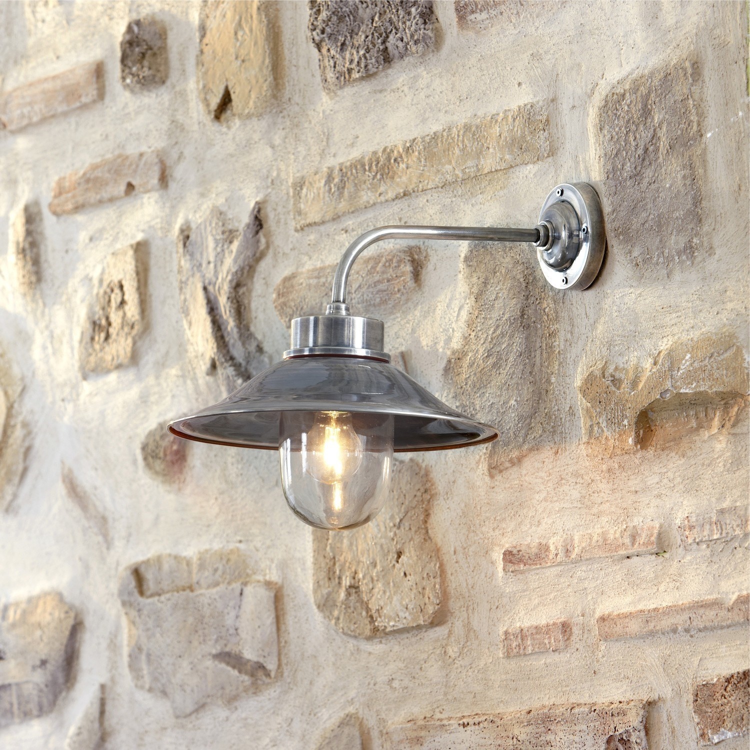 Traditionelles Design in moderner Umsetzung. Die hochwertige Außenwandlampe leuchtet den Eingangsbereich oder die Terrasse optimal aus. Ganz aus Messing mit glänzendem Antiksilber-Finish gearbeitet. Der robuste Glaszylinder schützt die Glühbirne.