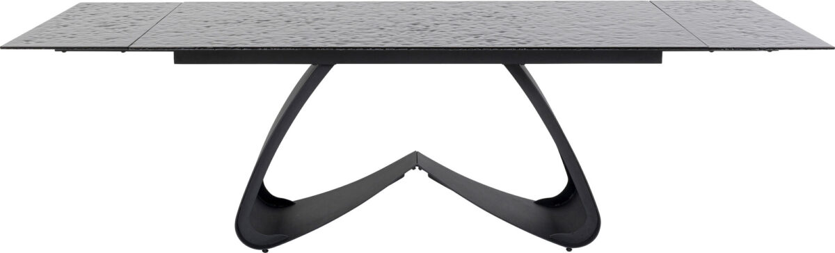 Funktion trifft exklusives Design bei diesem ausziehbaren Esstisch aus Stahl. Mit seinem Gestell in schwungvoller Form und mit der schwarzen Glasplatte, die wie eine leicht bewegte Wasseroberfläche auszieht, stellt Bellagio ein Designer-Tisch und Eyecatcher in Ihrem Esszimmer dar. Ein ausziehbarer Esstisch bietet Ihnen viele Vorteile im Essbereich. Er ermöglicht die Bewirtung einer flexiblen Anzahl von Gästen, spart Platz im Alltag, passt sich verschiedenen Anlässen an und ermöglicht eine anpassbare Tischgröße für ein angenehmes Esserlebnis. Material: (Gestell: Stahl pulverbeschichtet, Tischplatte: Glas Sicherheitsglas ESG gefärbt)