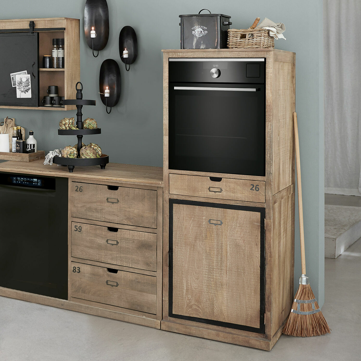 Man nehme die wohnliche Ausstrahlung eines Landhaus-Möbels und würze sie mit dem rauen Charme einer Industrial-Anmutung und schon ist ein Möbelstück kreiert, das viele sinnliche Genüsse verspricht. Schon beim Betreten der Küche wird der Blick sofort auf den Backofenumbau fallen, der sich in Augenhöhe befindet, was mehr als einen Vorteil bietet. Richtig ins Schwelgen aber werden Sie und Ihre Familie kommen, wenn ein Licht im Backofen brennt und sich die wunderbarsten Düfte daraus in der Küche verteilen. Nach selbstgebackenem Brot, nach Kuchen und Plätzchen und sicherlich oft nach herzhaften Gerichten. Denn bestimmt wird der Backofenumbau Einfluss auf Ihre Kochgewohnheiten nehmen, weil Sie es als wunderbar praktisch empfinden werden, wenn Sie sich nicht wie früher zum Backofen herunterbeugen müssen, sondern Bleche und Bräter rückenschonend hineinschieben und herausnehmen können. Natürlich nutzt der Backofenumbau geschickt auch den Platz unterhalb des Ofens und bietet mit zwei geräumigen Fächern hinter der Tür und einer Schublade viel Raum zum Verstauen unterschiedlichster Utensilien. Um den Genuss perfekt zu machen, ist der Backofenumbau natürlich auch optisch ein Leckerbissen – dank des rustikalen, sägerauen Mangoholzes. Mit seinem stylischen Design passt der Backofenumbau perfekt zu den anderen Modulen (21184, 21164, 21165, 21166) dieser Küchenserie. Alle Module sind auch als Set erhältlich (21186). Die passenden Hängeschränke erhalten Sie separat.