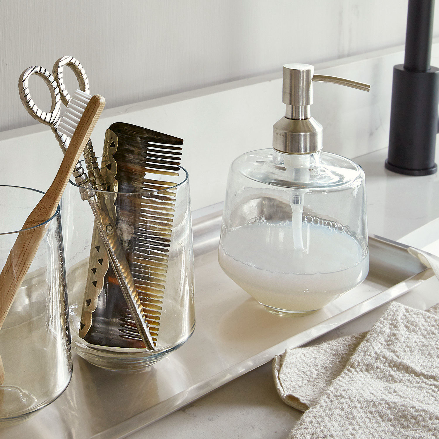 Absolut zeitlos zeigt sich dieses elegante Set aus Seifenspender, zwei Glasbechern und einem eleganten Tablett. Es besteht aus einem hochwertigen Materialmix: Das Tablett ist aus Messing und mit einem feinen, matten Finish überzogen. Der Ausgießer des Seifenspenders ist aus robustem Edelstahl und die Becher sind aus hochwertigem Glas gefertigt. Das edle Set ist bereits komplett kombiniert, sodass es gleich Ihr Bad zieren kann. Anstatt unschöner Plastikverpackungen zieht hiermit ein Hauch Luxus und guter Stil in Ihrer Wellness-Oase ein. Schonen Sie durch das Nachfüllen der Seife auch die Umwelt und freuen Sie sich auf einen attraktiven Akzent, der zu jedem Wohnstil passt. Die dezente Gestaltung beruhigt das Auge und macht immer eine gute Figur.