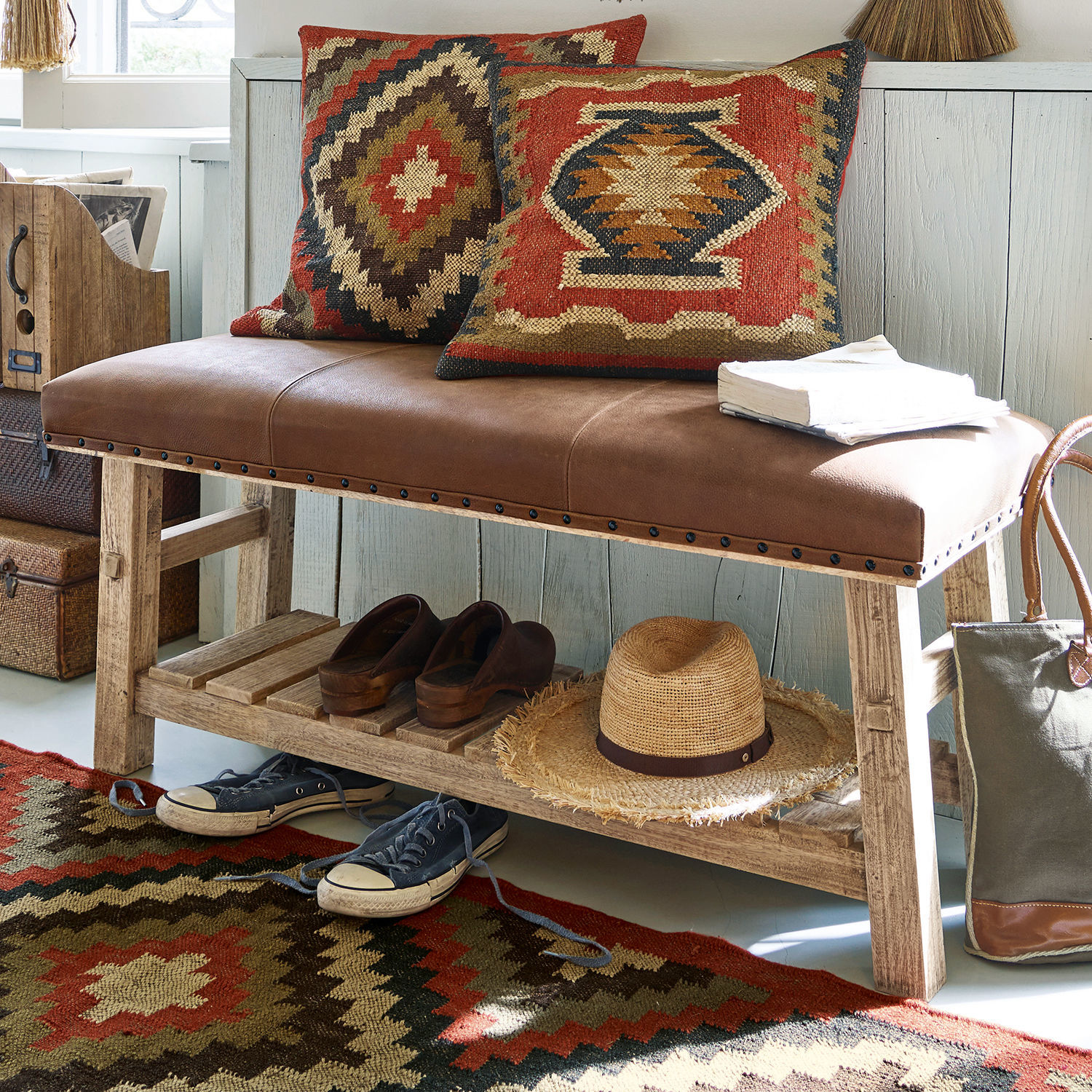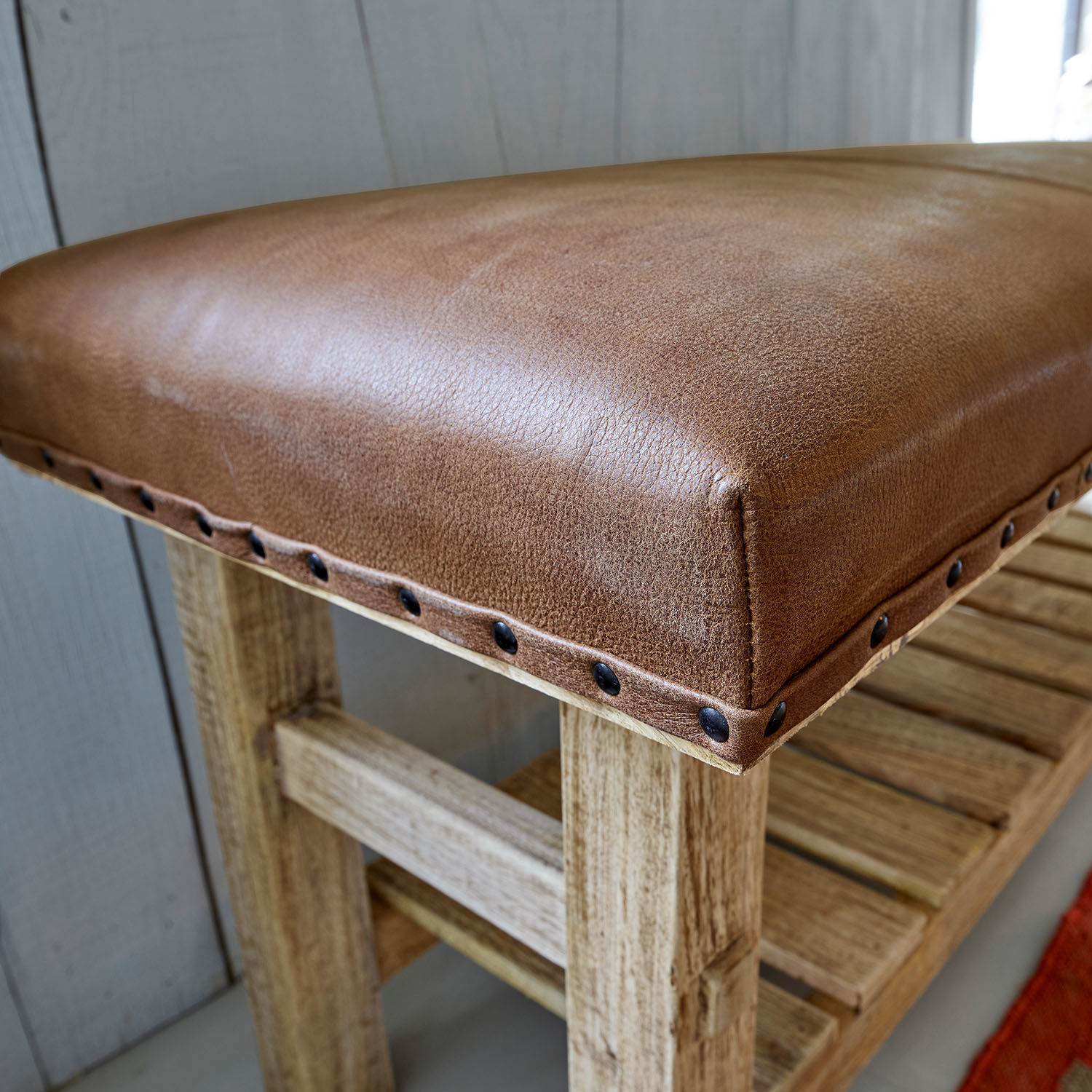 Erschöpft vom Einkaufsbummel in der City betreten Sie die Wohnung und lassen sich als erstes dankbar auf die Bank im Flur fallen, um schnell die unbequemen Schuhe abzustreifen. Oder kommen Sie mehrmals in der Woche von Ihrer Joggingrunde nach Hause und genießen es, sich kurz auf die neue Bank im Flur zu setzen, tief durchzuatmen und abzudampfen, bevor Sie ins Bad gehen? Nutzen Sie dann auch immer die Gelegenheit, die ganz eigene Haptik des edlen Büffelleders zu fühlen, das gröber und kräftiger ist als Rindsleder und deshalb seit Jahrhunderten als strapazierfähiger und langlebiger Bezugsstoff für hochwertige Sitzmöbel, Taschen und Börsen genommen wird. Wie viele edle Ledersorten wird auch das Büffelleder dieser Bank mit der Zeit eine individuelle Note annehmen, die seine Ausstrahlung nur noch beeindruckender macht. Doch auch das Mangoholz, an dem die Lederpolsterung ganz im traditionellen Stil mit Nieten befestigt wurde, ist mehr als einen Blick wert, zeigt es hier doch seine markante Maserung, die mit ihrer natürlichen Patina perfekt mit dem Leder harmoniert. Eine Bank mit Stil, die sich vor allem im Entrée des Hauses gut macht und ihre Ablagefläche als Aufbewahrungsort für die Schuhe anbietet, die häufig im Einsatz sind.