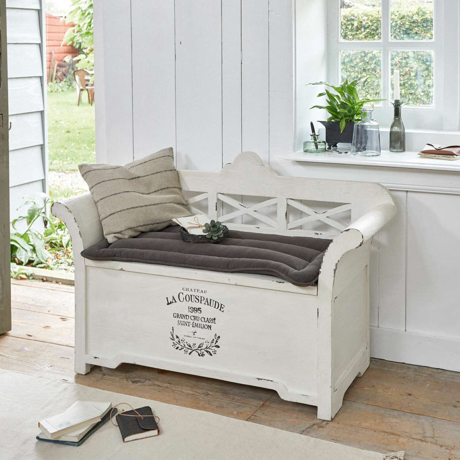 Dieses außergewöhnliche Schmuckstück ist viel mehr als nur eine Bank – es ist ein stilvoller Traum aus edlem Mangoholz im Shabby-Look. Das reizende Antik-Finish setzt es perfekt in Szene und sorgt zusammen mit dem hübschen Schriftzug vorne auf dem Korpus für einen romantischen Touch. Die geschwungenen Seiten wirken gediegen und gehen in die formschöne Rückenlehne über, die durch interessante Aussparungen eine angenehme Leichtigkeit erhält. Die Sitzfläche ist mit einem im Lieferumfang enthaltenen Kissen aus Baumwoll-Canvas versehen, kleine Bändchen halten die Auflage an Ort und Stelle, wenn Sie sich auf das bequeme Bänkchen setzen. Sehr gut wird es sich in Ihrem Flur machen und kann Ihnen dort als praktischer Helfer dienen, zum Beispiel beim An- und Ausziehen Ihrer Schuhe. Der überraschende Clou dieses wunderschönen Schmuckstücks aber befindet sich unter der Sitzfläche: eine große Truhe, die Ihnen viel Stauraum für verschiedenste Dinge bietet. Accessoires wie Schal, Mütze und Handschuhe finden ihren Platz, Hausschuhe lassen sich unterbringen oder auch saisonale Dekoartikel. Natürlich können Sie das bezaubernde Möbel beispielsweise auch als Ort zum Lesen während einer entspannten Auszeit nutzen. Sicher ist: Sie werden lange Freude an diesem stilvollen Bänkchen haben, das schöner Eye-Catcher und praktischer Tausendsassa zugleich ist.