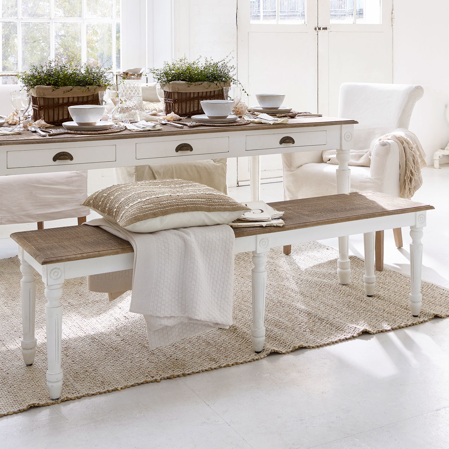 Kann eine Einladung zum Platznehmen charmanter ausgesprochen werden? Wir finden nicht. Denn diese Bank im klassischen Landhaus-Look ist von Kopf bis Fuß ein bezauberndes Schmuckstück, das sofort das gemütliche Flair traditioneller Landhaus-Küchen verbreitet. Die Bank ist aber auch ein schönes Beispiel dafür, dass es heute noch Handwerker gibt, die die alte Kunst der Möbelschreinerei par excellence beherrschen und mit viel Liebe zum Detail ans Werk gehen. Davon zeugen die aufwändigen Verzierungen an den Beinen ebenso wie die sauber gearbeitete Sitzfläche mit den sanft abgerundeten Kanten. Komplett aus massivem Mangoholz gefertigt zeigt die Sitzfläche einen warmen Naturholzton, zu dem die Beine mit ihrem weißen Finish einen hübschen Kontrast bilden. Dieser Mix aus Braun mit Weiß ist übrigens typisch für die moderne Generation von Landhaus-Möbeln, die neben der gemütlichen Note auch die frische Ausstrahlung dieser Farbkombination schätzen. Im gleichen Stil gearbeitet wie der passende Esstisch ergänzt die Bank diesen zu einer herrlich nostalgischen Essgruppe, sie kann aber auch zu anderen Tischen kombiniert werden und ist sogar solo ein charmanter Raumschmuck. Nicht zuletzt aber wird Sie die Bank mit ihrer praktischen Funktionalität bezaubern.