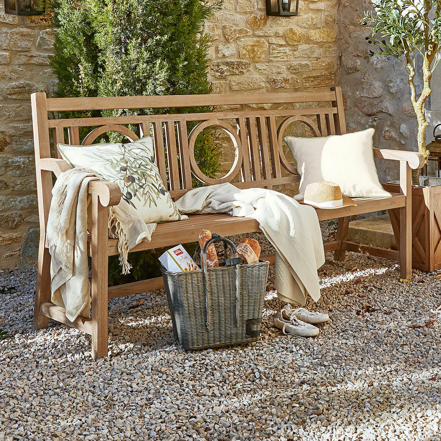 Ein kunstvolles Spiel schöner Formen: Bei dieser außergewöhnlichen Bank vereinen sich klare gerade Linien mit geschmackvoll eingearbeiteten Rundungen, die kreisförmig in die Rückenlehne eingearbeitet sind. Auch das Material wurde mit Bedacht gewählt: Die Bank ist vollständig aus robustem Teakholz, das nicht nur besonders widerstandsfähig ist, sondern aufgrund seiner natürlichen Maserungen auch besonders schön. Verstärkt werden diese durch das leichte White-Washed-Finish, das die Bank verziert. Ein wunderbares Möbelstück für Ihren Garten oder Ihre Terrasse, auf dem Sie sich niederlassen können und garantiert immer wohlfühlen werden. Freuen Sie sich auf viele entspannte Momente – allein im Sonnenschein oder zusammen mit Freunden oder der Familie!