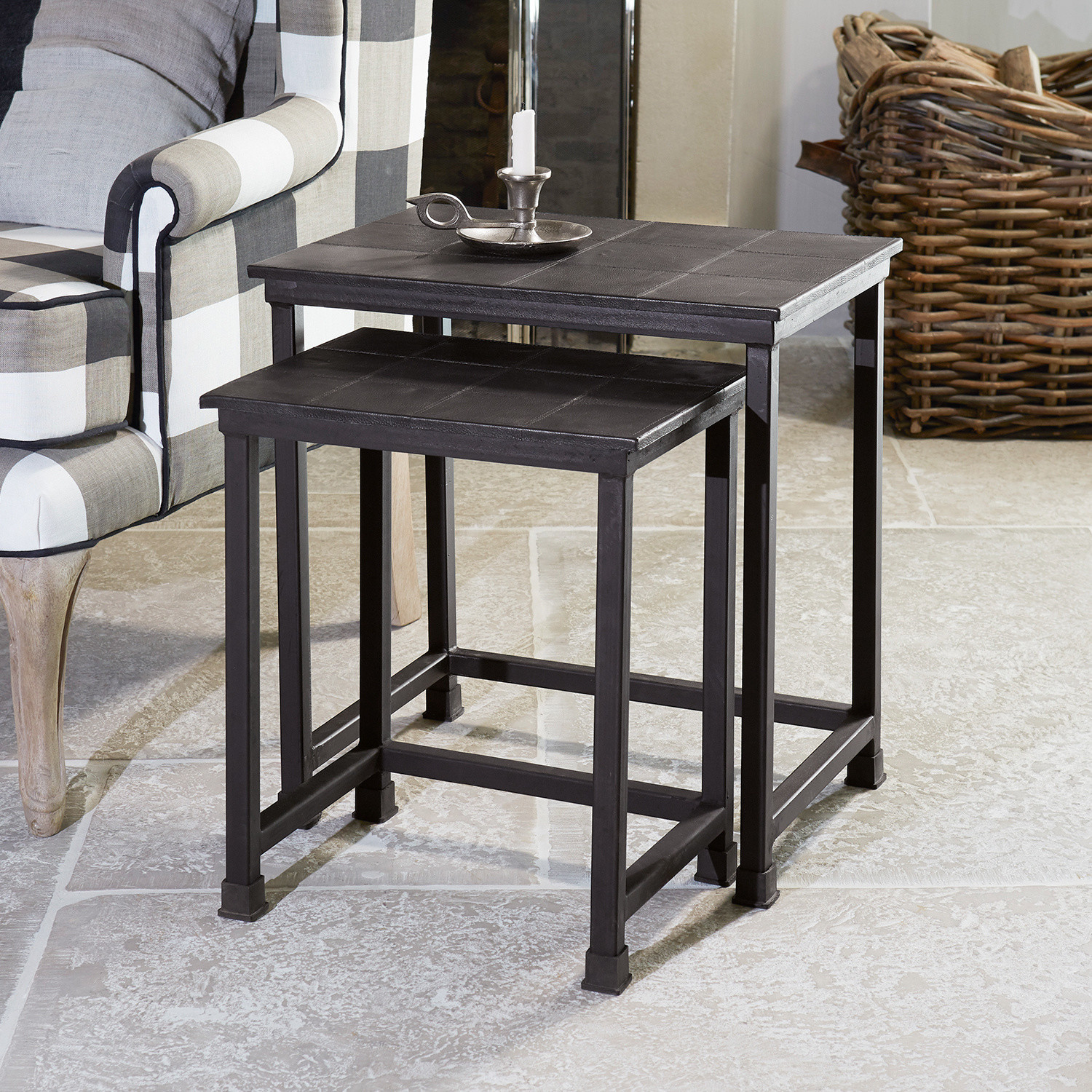 Attraktiver Material-Mix aus Eisen und hochwertigem Büffelleder. Mit dekorativen Leder-Quadraten bezogene Tischplatten. Im Set erhalten Sie zwei Größen. Dieses Duo […]