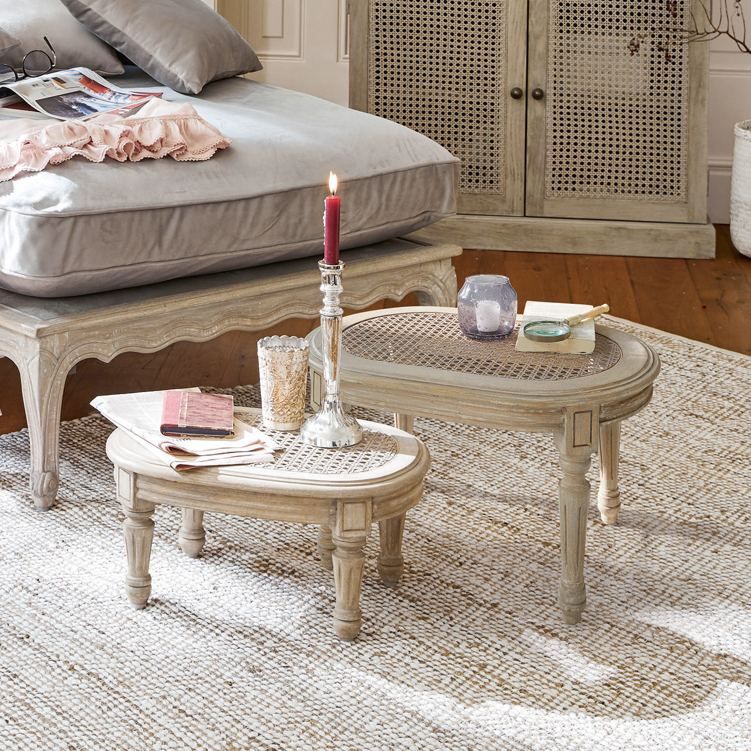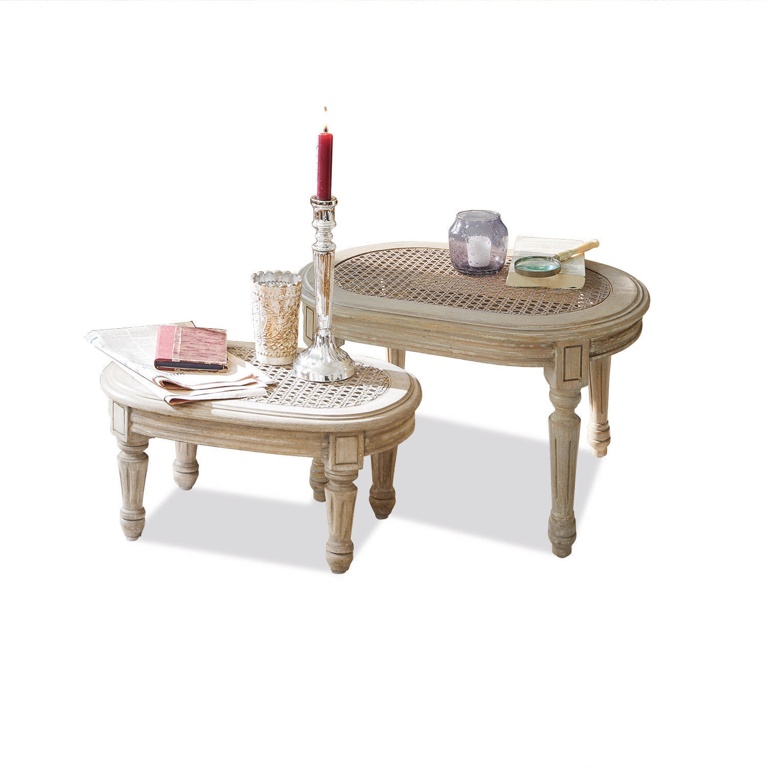 Dieser Beistelltisch erinnert an den noblen Charme vergangener Epochen, als in den legendären Wiener Kaffeehäusern Stühle standen, deren Sitzfläche aus einem luftigen und dabei extrem stabilen, achteckigen Rohr-Geflecht bestand. Nachdem diese Sitzbespannung dort über Jahre und Jahrzehnte den ultimativen Qualitätstest bestanden hatte, begann es als berühmtes Wiener Geflecht seinen Siegeszug um die ganze Welt. Heute hat es einen festen Platz im gehobenen Landhaus-Ambiente, wo schon immer großer Wert auf traditionelle Handwerkskunst und beste Material- und Verarbeitungsqualität gelegt wird. Für diesen Beistelltisch wurde das Wiener Geflecht mit erlesenem Mangoholz kombiniert, das nach allen Regeln der traditionellen Tischlerkunst üppig von Hand verziert und dessen Beine liebevoll gedrechselt wurden, während das dezente Antik-Finish die nostalgische Note des Tischchens unterstreicht. Kurz: Der Beistelltisch ist ein kleines Schmuckstück, das Ihr Wohninterieur – und Ihre kostbare Freizeit – an den verschiedensten Stellen im Haus bereichern wird. Als Pärchen dient Ihnen das Tisch-Set vor oder neben der Couch als stilvoller Abstellplatz für Ihr Glas, die Fernbedienung oder das Tablet. Sie können das Duo aber auch trennen, damit Ihnen ein Tisch als Couchtisch dienen kann, während der andere neben Ihrem Lieblingssessel auf Sie warten darf.