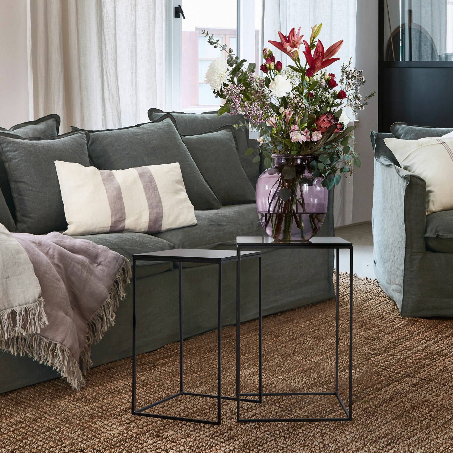 Eine kunstvolle Optik im Industrial- Stil, bei der sich Eisen und getöntes Glas eindrucksvoll vereinen: Dieses Duo aus zwei Tischen für Ihre Couch besticht nicht nur durch sein mondänes Design, sondern auch durch seine durchdachte Funktion. Die stilvollen Beistelltische lassen sich ganz einfach auseinander oder ineinander verschieben. Für einen aufgeräumten Gesamteindruck können Sie das kleinere Tischchen unter dem größeren „verstecken“. Stellen Sie sich vor, Sie bekommen Gäste – ein Handgriff und die schicken gläsernen Abstellflächen bieten Platz für Speisen und Getränke aller Art oder schicke Dekoration. Ihre Gäste werden beeindruckt sein von diesem schönen und zugleich praktischen Paar, das Raffinesse mit mondänem Flair wunderbar verbindet.