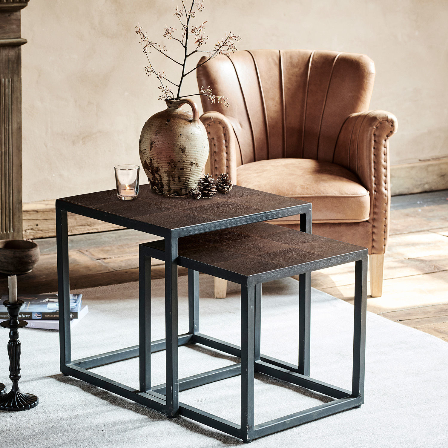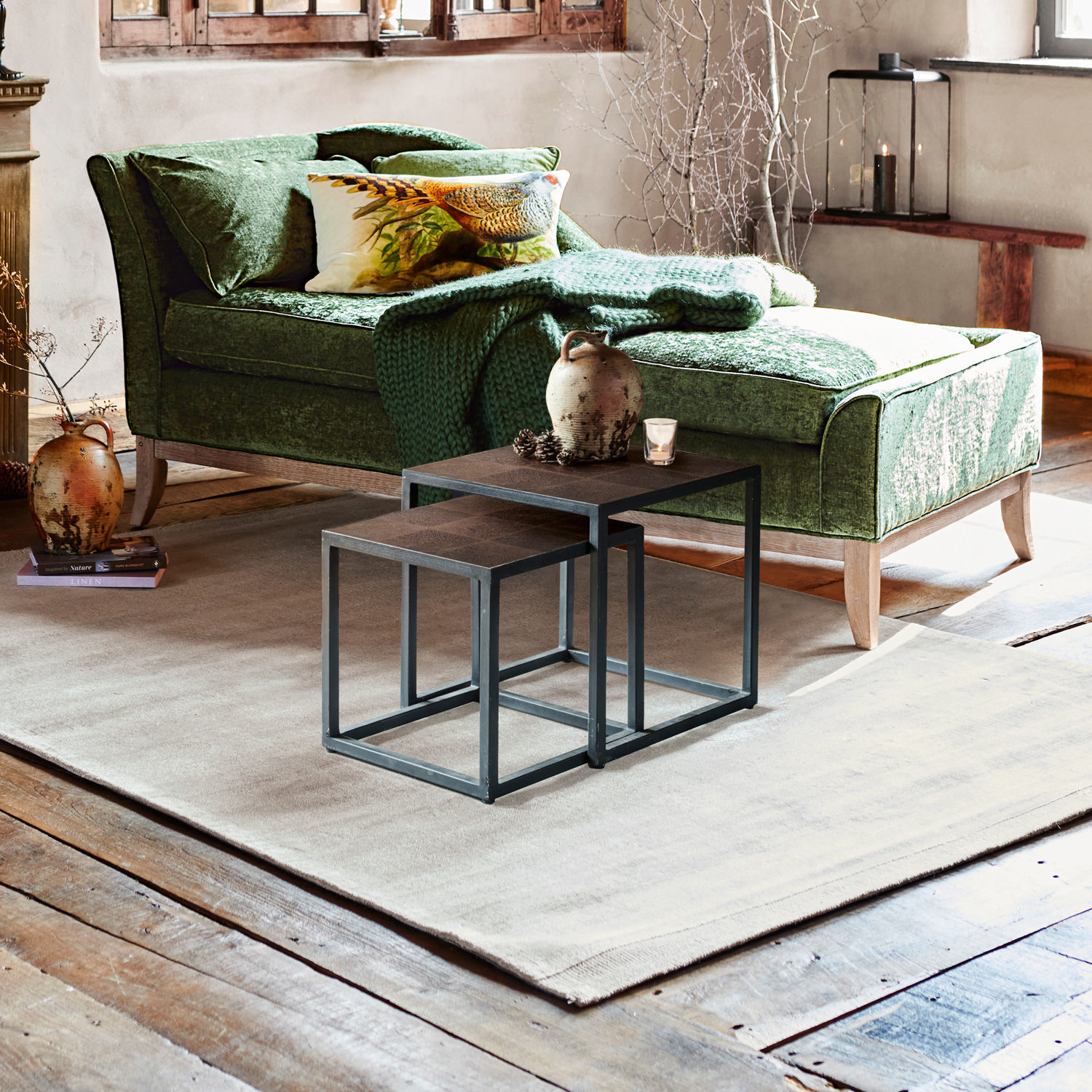 Vielleicht spüren auch Sie manchmal eine gewisse Jagdleidenschaft in sich? Sie sind dann aber nicht auf der Pirsch nach wilden Tieren, sondern auf der Suche nach Einrichtungsgegenständen, die das gewisse Etwas an Ausstrahlung haben. Möbel und Accessoires, die man nicht überall findet und die Ausdruck Ihrer Persönlichkeit sind. Dann haben Sie hier die richtige Fährte aufgenommen und mit dem Beistelltisch im 2er Set etwas viel Besseres als einen Sechzehnender entdeckt: ein Tischset, dessen Platten mit Quadraten aus echtem Büffelleder bezogen sind. Büffelleder ist ein sehr robustes und langlebiges Leder, das eine typische, grobporige Oberfläche aufweist, auf der die Natur oftmals die eine oder andere Spur hinterlassen hat, denn die Büffel verbringen ihr Leben fast ausschließlich unter freiem Himmel. Büffelleder ist aber auch bekannt dafür, dass es mit der Zeit eine ganz eigene Patina annimmt, was den optischen Reiz dieses Naturmaterials und die dekorative Raumwirkung des Tischsets noch erhöht. Und weil kein Stück Leder dem anderen gleicht, ist jeder Beistelltisch ein Unikat. Das modern designte Gestell aus Eisen harmoniert hervorragend mit dem rustikalen Flair des Tischsets und verleiht ihm zugleich eine beachtliche Stabilität und Tragfähigkeit.