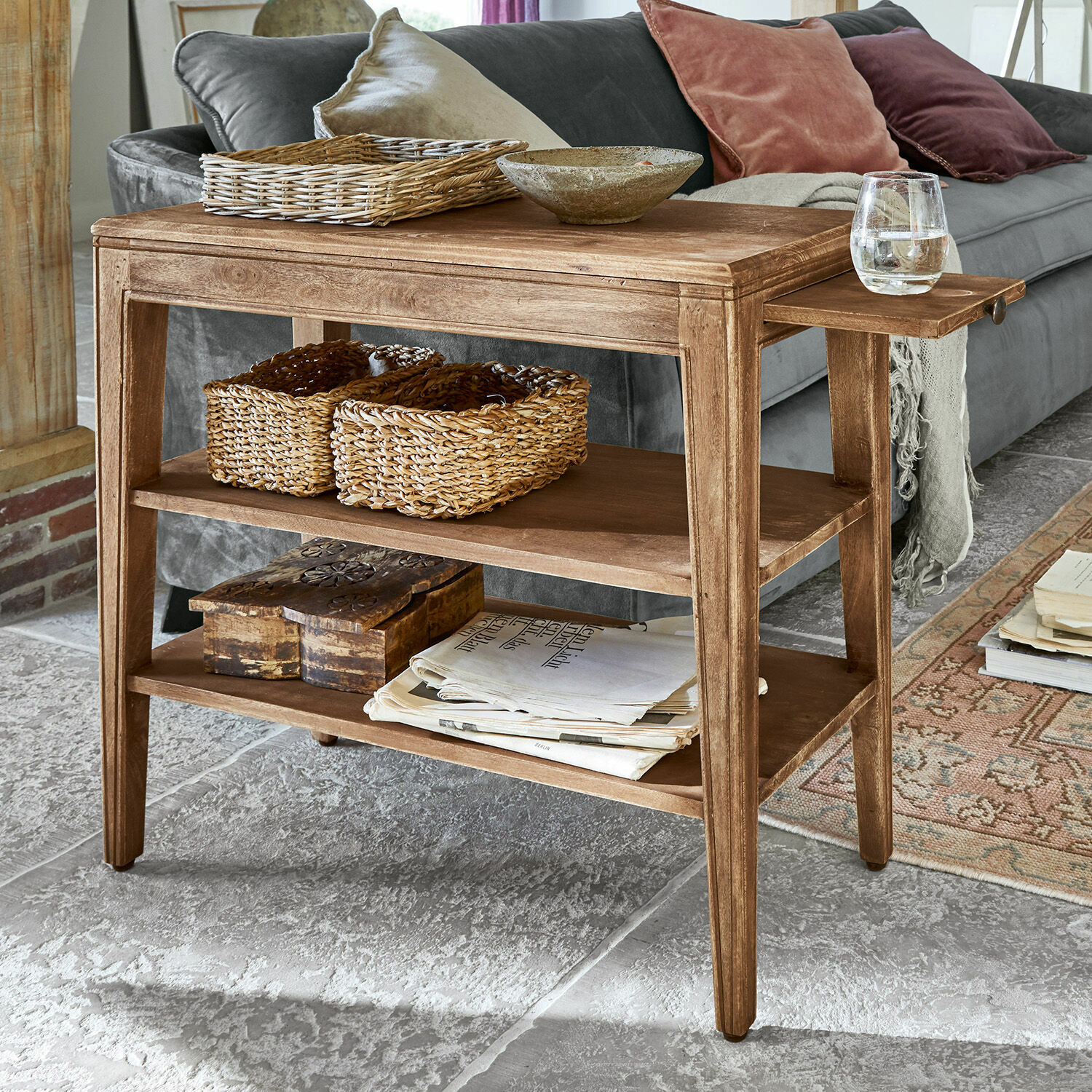 Landhaus-Look und Holz – das gehört zusammen wie Licht und Schatten oder Sonne und Regen. Deshalb wählte der Designer für diesen Beistelltisch folgerichtig hochwertiges Mangoholz, ein Tropenholz mit einer ausgezeichneten Härte und einer besonders lebendigen Maserung, die jedem Möbelstück einen natürlichen, unverwechselbaren Charme verleiht. Und das Wort Tropenholz bedeutet bei diesem Beistelltisch nur, dass das Holz in den Tropen gewachsen ist, wie die Früchte, die Jahr um Jahr an dem Baum gereift sind. Das heißt: Mangoholz ist ein Nebenprodukt des Obstanbaus und das Holz gehört dadurch zu den ökologisch wertvollen, nachhaltigen Hölzern. Weil der Designer um die besondere Ausstrahlung des Holzes wusste, hat er sich nicht nur in puncto Gestaltung auf eine schlichte Formgebung beschränkt, sondern auch bewusst auf ein Finish verzichtet, so dass sich das wiederaufbereitete Mangoholz bei diesem Beistelltisch in seiner naturbelassenen Schönheit präsentieren kann. Doch selbstverständlich beschränkt sich der Beistelltisch nicht darauf, gut auszusehen, sondern bietet Ihnen viel Platz auf seinen zwei Regalböden und der oberen Holzplatte. Und wenn dieser Platz nicht ausreicht, ziehen Sie einfach an der Seite mit einem Handgriff eine weitere Ablagefläche heraus.