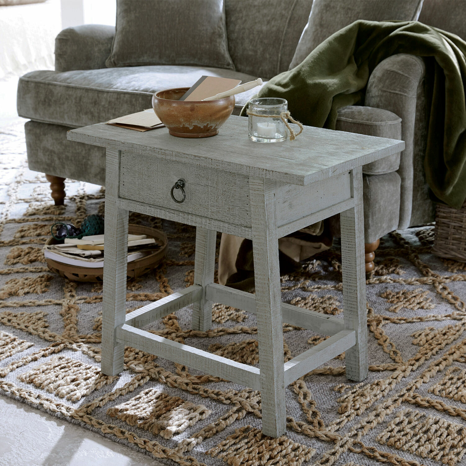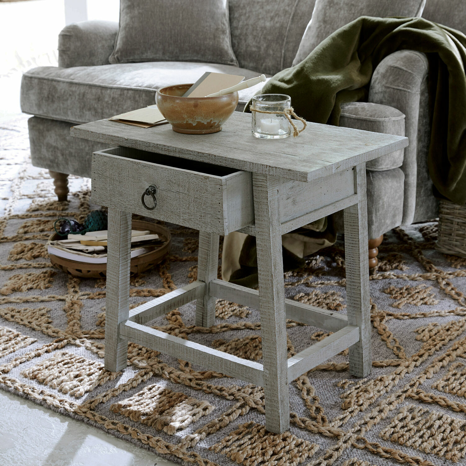 Der Landhaus-Stil ist ohne das Naturmaterial Holz nicht denkbar. Aber viele Liebhaber dieses naturbetonten Wohnstils wünschen sich interessantere Hölzer als Kiefer und Co. Denn jedes Holz hat andere Eigenschaften und auch eine andere Ausstrahlung, die sich dem jeweiligen Möbelstück mitteilt. Dieser Beistelltisch besteht aus seltenem, wiederaufbereitetem Salbaumholz, das schon seit langem wegen seiner außerordentlichen Härte geschätzt wird, bisher jedoch überwiegend im konstruktiven Bauwesen. In letzter Zeit aber hat dieses Holz auch im Möbelbereich für Aufsehen gesorgt, denn die grobe, faserige Struktur des Holzes harmoniert perfekt mit den einfachen Formen schlichter Bauernmöbel. Für diesen Beistelltisch hat sich der Designer mit der von Natur aus urigen Holzoptik aber nicht zufriedengegeben und das Holz außerdem mit einem Farb-Finish veredelt, so dass es jetzt einen dezent grauen Farbton zeigt – als wäre es in vielen Jahren von der Sonne ausgebleicht. Doch neben dem rustikalen Look weiß der Beistelltisch auch durch praktische Eigenschaften zu gefallen. So bietet er Ihnen seine Platte als Abstellfläche und die Schublade mit dem hübschen Ring-Griff als Stauraum für die verschiedensten Dinge an.