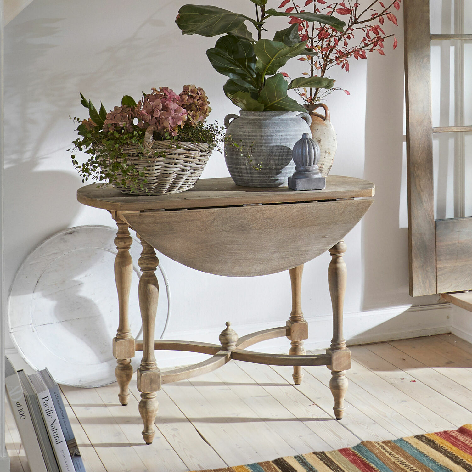 Aus rund wird eckig: Unser Beistelltisch überrascht mit seiner praktischen Wandelbarkeit. Denn Form und Größe lassen sich durch die klappbaren Seitenteile perfekt an Ihre Bedürfnisse zu Hause anpassen. Benötigen Sie mehr Fläche, nutzen Sie die größere runde Variante. Genügt ein kleinerer Tisch, braucht es lediglich zwei Handgriffe und die platzsparende, eckige Alternative steht vor Ihnen. So oder so, auf diesem Möbelstück aus hochwertigem Mangoholz mit feiner Maserung und dezentem White-Washed-Finish lassen sich die verschiedensten Utensilien griffbereit platzieren. Stellen Sie Kaffeekanne und -tassen darauf oder legen Sie beispielsweise Ihre aktuelle Buchlektüre und ein Rätselheft ab. Dank seiner Größe ist der Tisch zum Beispiel auch für Brettspiele mit der Familie oder Freunden bestens geeignet. Die gedrechselten Tischbeine mit ihren hübschen Rundungen und Unterteilungen sind zusammen mit den leicht geschwungenen Verstrebungen im unteren Bereich ein zusätzlicher Blickfang und geben dem Ganzen eine besonders charmante Note. Durch seinen natürlichen Look passt das Schmuckstück zu vielen Einrichtungsstilen und macht im Wohnzimmer, aber auch in anderen Räumen, wie im Wintergarten oder Gästezimmer, eine bella Figura.