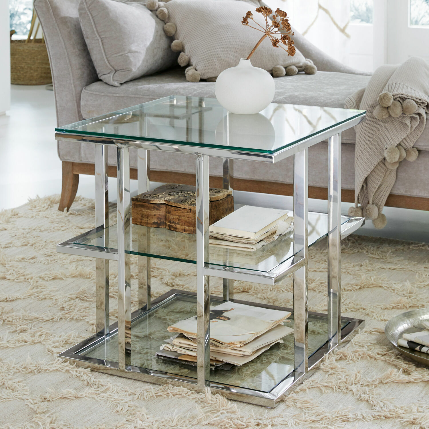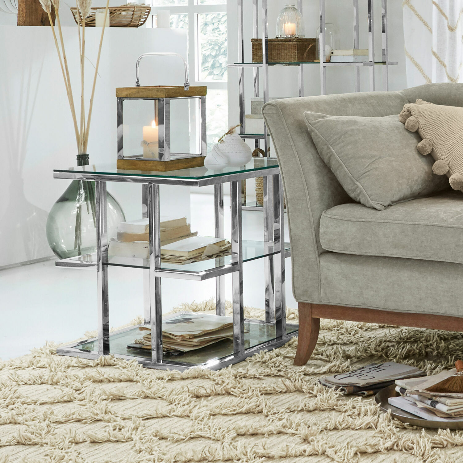 Gerade Linienführung und ein Material-Mix mit kühl-sachlicher Ausstrahlung – mehr braucht es nicht, um einen Beistelltisch zu kreieren, der sich in jedem Ambiente behaupten kann. Allerdings muss das Design dafür auf den Punkt, die Materialien erkennbar hochwertig und die Verarbeitung exzellent sein. Wie wir Ihnen das für diesen Beistelltisch garantieren können. Das schlicht designte Gestell wirkt angenehm offen, weil der luftige Korpus alleine von Strebungen aus hochglänzendem Edelstahl gebildet wird und so je nach Jahreszeit mal die Sommersonne und mal den Schein der Kerzen reflektiert, die Sie im Raum entzünden. Auf insgesamt drei Ebenen wurden Ablageflächen aus Glas integriert, die – steht nichts drauf – kaum zu erkennen sind. Die sich aber im Alltag zum Abstellen diverser Dinge anbieten. Ganz erstaunlich ist, wie gut sich der schlichte, aber trotzdem elegante Beistelltisch in die verschiedensten Interieurs integrieren lässt. Ob neben einem stylischen Lounger, als Begleiter eines klassischen Chesterfield-Sessels oder als Duo vor einer eleganten Sofalandschaft im italienischen Stil – dieser zeitlose Beistelltisch wird immer ein klares Statement setzen.
