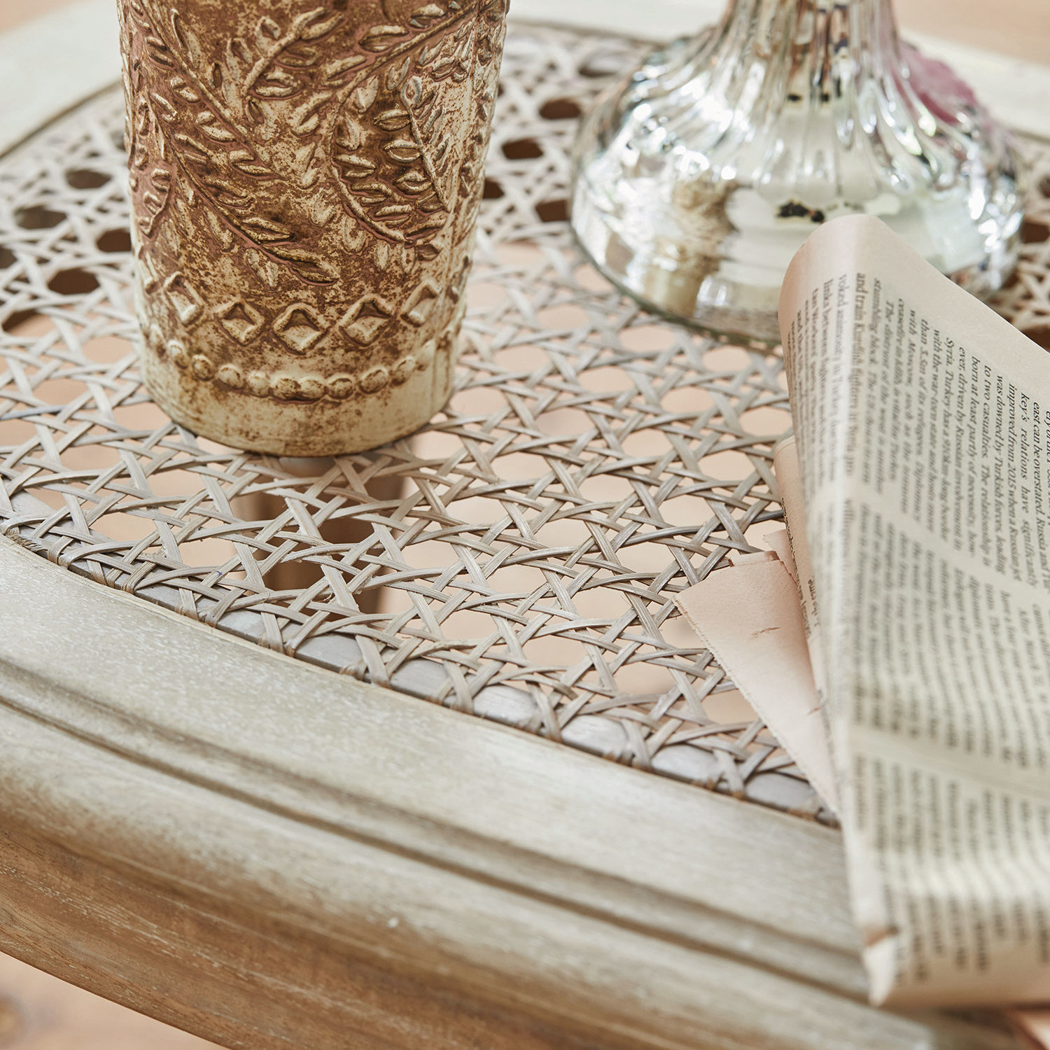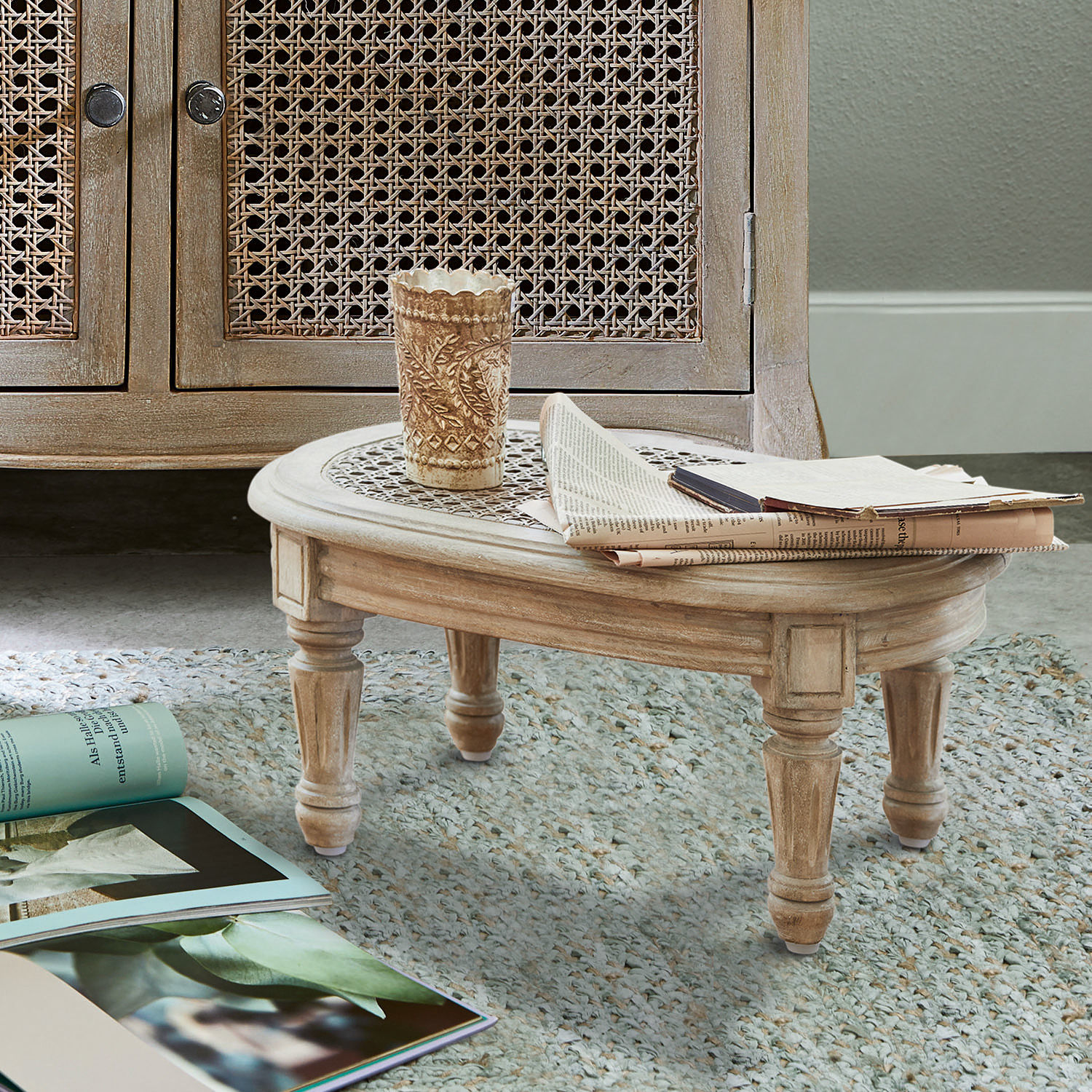 Ein besonders stilvolles Beistelltischchen! Kein Wunder, dass sich solche kleinen Wohn-Accessoires schon vor Jahrhunderten einen festen Platz im Wohn-Ambiente erworben haben. Allerdings findet man selten ein so erlesenes Objekt wie dieses. Der Korpus aus massivem Mangoholz ist über und über aufwändig verziert – ein wunderbares Beispiel für die Kunstfertigkeit des Handwerkers, wie sie in früheren Zeiten gang und gäbe war, während das dezente Antik-Finish das nostalgische Flair dieses Beistelltisches besonders schön zur Geltung bringt. Sieht er nicht aus als blickte er bereits auf eine aufregende Vergangenheit im Boudoir oder Salon einer vornehmen Dame zurück und könnte uns spannende Geschichten darüber erzählen? Vollendet wird die Kreation durch das hochwertige Wiener Geflecht, ein luftiges und dabei extrem stabiles, achteckiges Rattan-Geflecht, das schon im 19. Jahrhundert als Sitzfläche für den legendären Wiener Kaffeehausstuhl diente. Ganz gleich, ob Sie diesen Beistelltisch neben die Chaiselongue stellen, um ein Getränk und Ihr Buch griffbereit zu haben, oder ob er vor Ihrem Lieblingssessel steht und Sie zum Entspannen die Füße auf ihm ablegen – eines ist sicher: Auf diesen Beistelltisch werden Sie nie wieder verzichten wollen. Denn er hat Ihr Herz mit seiner erlesenen Optik wie mit seiner praktischen Funktion im Sturm erobert.