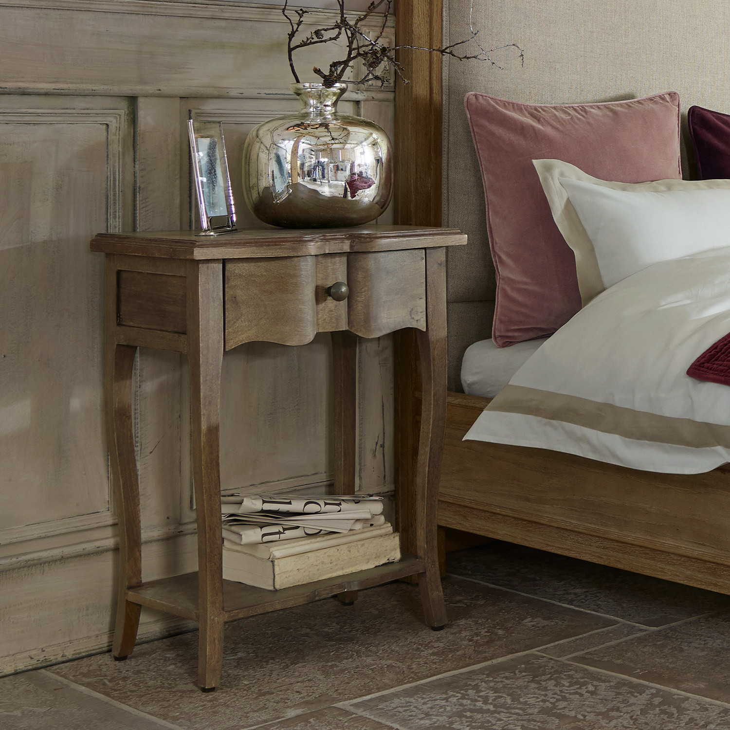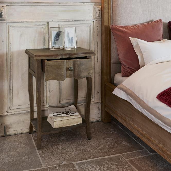 Kunstvoll geschnitztes Tischlein. Formschönes, klassisch elegantes Design. Aus Mangoholz mit einem Schubladengriff aus Gusseisen. Ein hübscher Hingucker aus […]