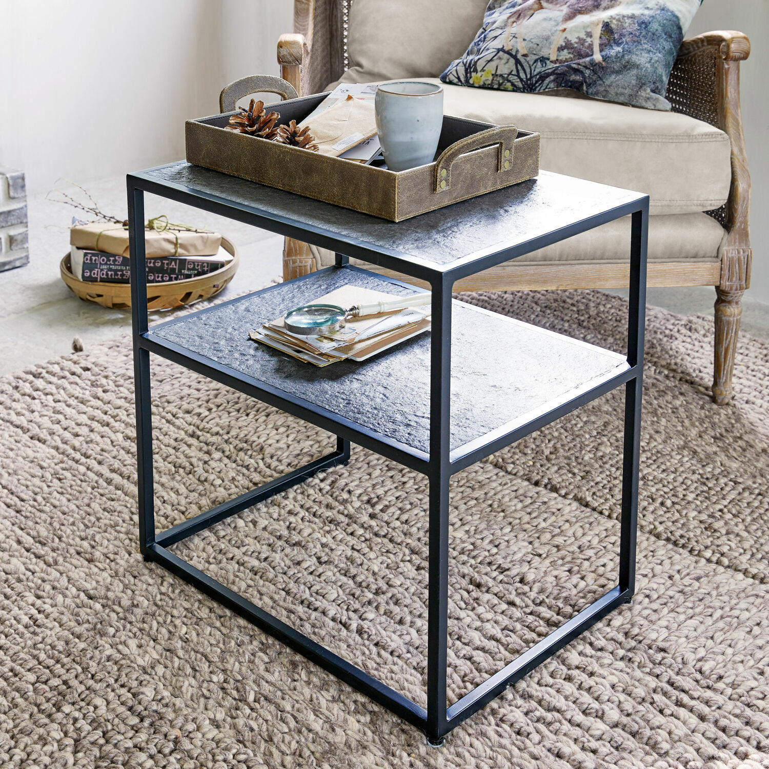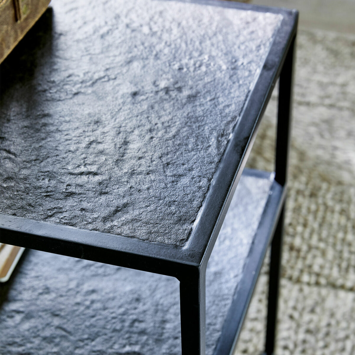 Wenn es ans Einrichten einer Wohnung oder eines Raumes geht, stehen in der Regel erst einmal die Hauptdarsteller im Fokus. Man entscheidet über Sofa, Sessel und Wandregal und lässt so Stück für Stück den gewünschten Wohnstil Form annehmen. Genau der Moment, um sich nun mit dem perfekten Beistelltisch um den Feinschliff der Einrichtung zu kümmern. Denn er komplettiert Sofa und Sessel, macht sie zur harmonisch abgestimmten Wohnlandschaft, die nun den Feier- oder Film-Abend zum Rundumgenuss werden lässt. Schließlich finden auf dem Beistelltisch dann Ihre beiden Gläser und die feinen Snacks einen Platz oder warten auf der unteren Ablage Zeitschriften und der aktuelle Roman darauf, von Ihnen gelesen zu werden, während tagsüber ein oder zwei ausgewählte Accessoires für den perfekten Look sorgen. Dabei ist dieser Beistelltisch schon für sich alleine ein spannender Blickfang, der mit klarer Formensprache und eleganter Farbgebung überzeugt. Das Gestell wurde komplett aus dunklem Eisen gefertigt und trägt als Tischplatten zwei edle Keramikfliesen, die mit einer individuellen Struktur begeistern. Ein äußerst stabiles Möbelstück also, das sich auch gerne neben Ihrem Lieblingssessel oder im Flur für Sie nützlich macht.