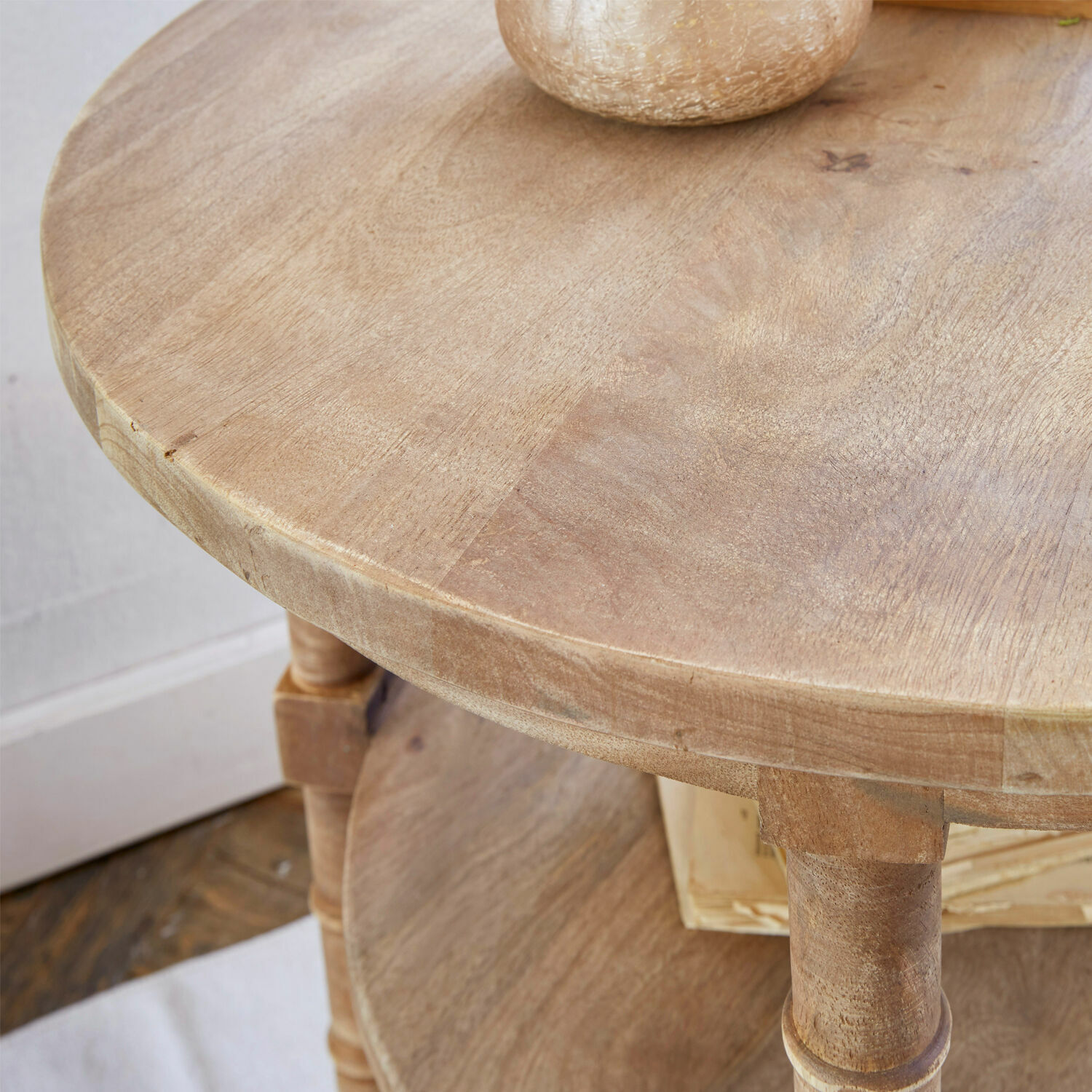 Es gibt Möbelstücke, die von Generation zu Generation weitergegeben werden und schon viele Interieurs bereichern durften. Oftmals geht es dabei nicht um ausladende Schränke oder Kredenzen, sondern vielmehr um kleinere Möbelstücke wie Kommoden und Beistelltische, die auf ihrem Weg durch die Jahrzehnte schon Erfahrung darin sammeln durften, wie man sich in die verschiedensten Wohnstile harmonisch einfügt und trotzdem Präsenz beweist. Auch dieser Beistelltisch setzt auf die dekorative Wirkung des ländlich-rustikalen Stils, mit dem sich antike Landhaus-Möbel noch heute bei uns beliebt machen. Dieser reizvolle Beistelltisch ist zwar nicht vor hundert Jahren entstanden, aber sein antikbraunes Finish und traditionelle Stilelemente wie die aufwendig von Hand gedrechselten Beine und der Reliefkranz an der oberen Platte erwecken gekonnt diesen Eindruck. Und lassen deutlich die Handschrift eines erfahrenen Schreiners erkennen, der für diesen Beistelltisch zu edlem Mangoholz gegriffen hat. Was dem Möbelstück nicht nur die Ausdrucksstärke dieses beliebten Hartholzes verleiht, sondern auch noch den Aspekt der Nachhaltigkeit zur Liste seiner positiven Eigenschaften hinzufügt. Schließlich handelt es sich dabei um ein Nebenprodukt des Obstanbaus.