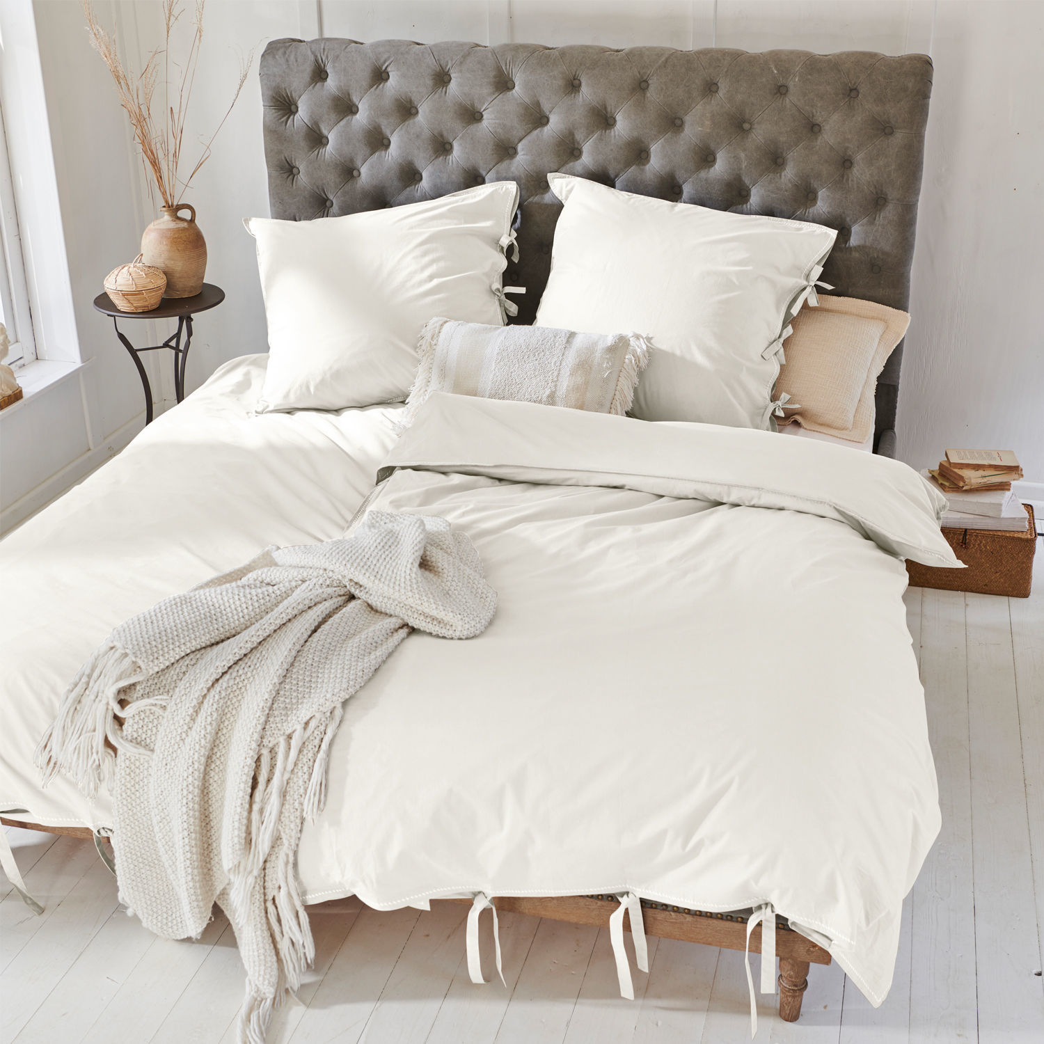 Für Wohlfühl-Ambiente im Schlafzimmer ist mit diesem wundervollen Set aus reiner Baumwolle gesorgt. Im Lieferumfang enthalten sind ein Bezug für die Decke und ein Kopfkissenbezug. Die Ränder des unifarbenen Sets zieren feine Stickereien. Zur Auswahl stehen drei sehr harmonische Farbtöne. Diese können auch in Mix&Match-Manier untereinander kombiniert werden. Das hautsympathische Naturmaterial garantiert ein sehr angenehmes Schlafklima. Das zeitlos schöne Design passt ganz hervorragend zu vielen Einrichtungsstilen. Ob zum Long-Island-Stil mit erfrischendem Küsten-Flair, zum gemütlichen Landhaus-Stil mit hellen Möbeln oder zum rustikalen Chalet Chic mit viel naturbelassenem Holz – dieses zeitlos schöne Gespann schmeichelt einfach jedem Schlafgemach und macht die Bettruhe zum Genuss. Wenn Sie am Wochenende sich noch einmal genüsslich in die Decke kuscheln, können wir das sehr gut verstehen.