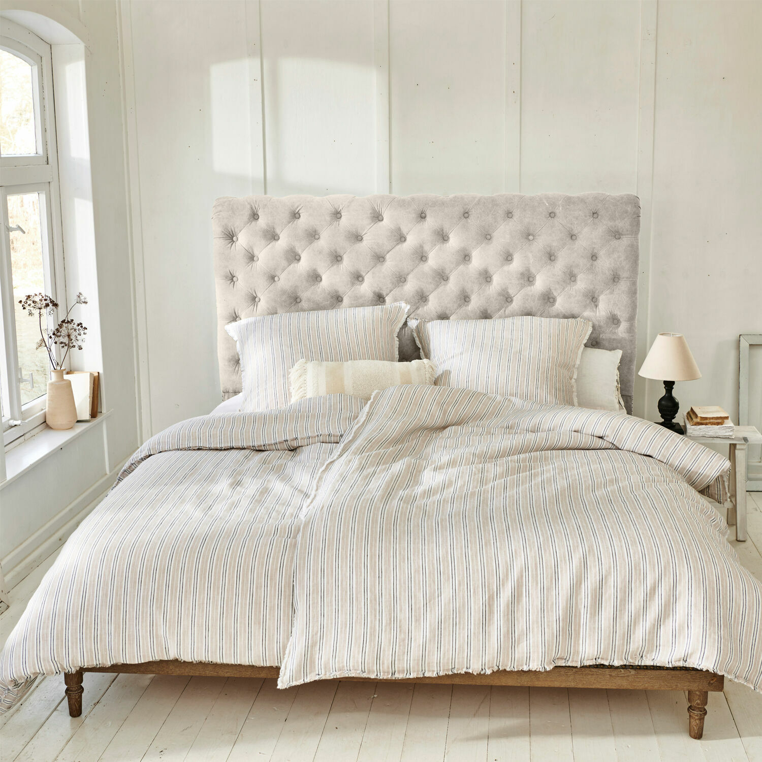 Schlafen, erholen, entspannen – und immer bei idealer Temperatur, ohne zu schwitzen oder zu frieren: Diese schicke Bettwäsche mit ihrem wunderbar weichen Feeling wird Sie rundum verwöhnen. Das gewaschene Leinen besteht aus natürlichen Pflanzenfasern und speichert die umgebende Luft. Es kann bei kalten Temperaturen wärmen, während es bei heißen Tagen angenehm kühlt. Das nachhaltige Naturmaterial ist reißfest, glatt, fest und zudem flusenfrei, so haben Bakterien und Schmutz kaum eine Chance, sich festzusetzen. Damit können Sie sicher sein, dass Ihre Leinenbettwäsche lange Zeit nichts von ihrer Schönheit verliert. Was macht gewaschenes Leinen so besonders? Durch diesen Waschprozess erhält das Leinen eine ganz besonders weiche Oberfläche und geht bei späteren Wäschen auch nicht mehr ein. Das stilvolle Streifenmuster, der feine Fransensaum und die schmucken Knöpfe runden dieses Schmuckstück von einer Bettwäsche wunderbar ab.