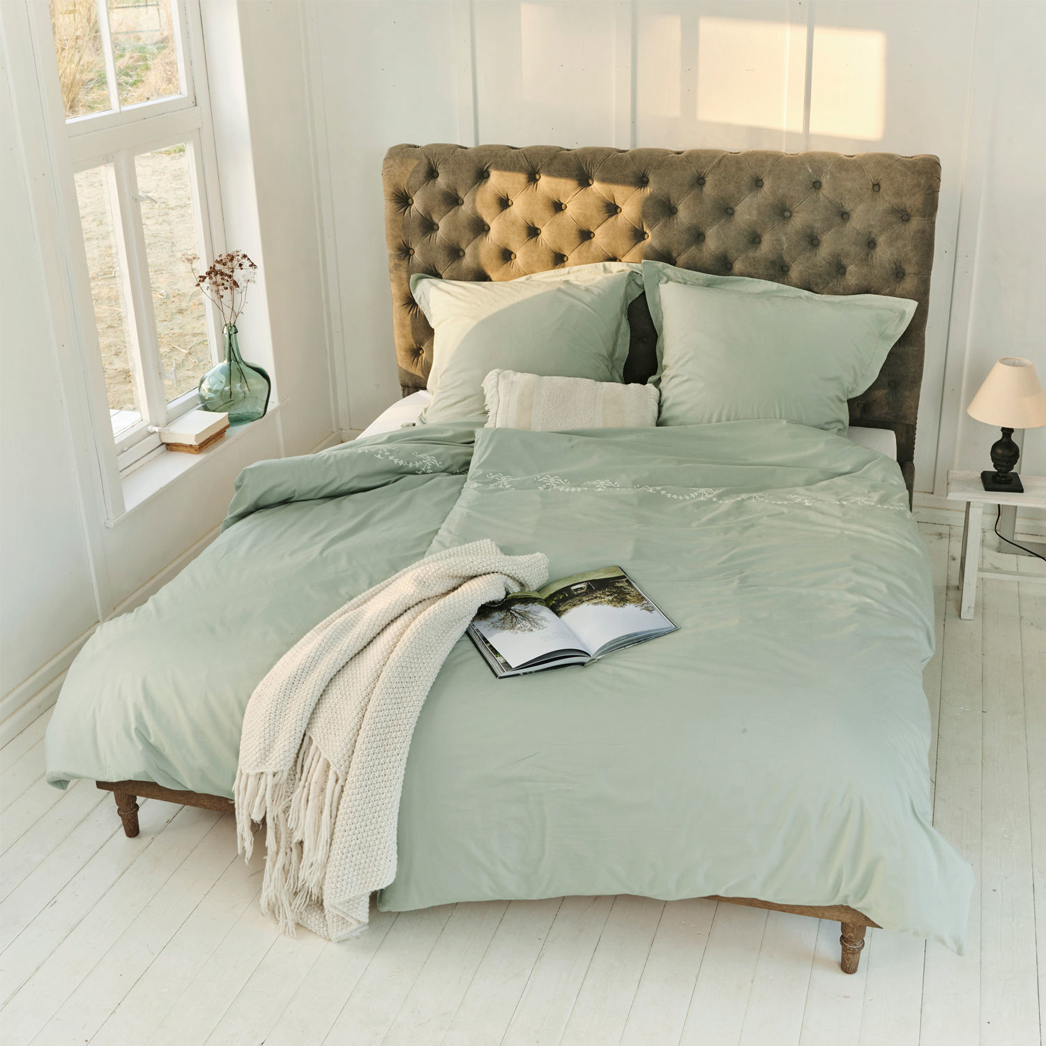 Stellen Sie sich vor, wie Sie nach einem erholsamen Schlaf morgens mit den ersten Strahlen der Sonne aufwachen – und was Sie fühlen ist die traumhaft weiche Oberfläche Ihrer Bettdecke, die sich an Sie schmiegt. Doch nicht nur die wohlige Haptik dieses feinen Bettbezugs im französischen Stil lädt zum Verweilen in den Federn ein – auch der Anblick des ebenso schönen wie filigranen Blumenmotivs verzaubert, so dass Sie die Morgenstunde noch ein wenig ausdehnen und den Tag mit seinen Aufgaben gelassen auf die Wartebank verbannen. Denn die aufgedruckte Bordüre, welche die Bettdecke hübsch umspielt, ist mit den stilisierten floralen Arabesken zu faszinierend, um den Blick von ihr zu lösen. Und um das Kopfkissen spannt sich ein wundervoll rahmender Hohlsaum. Ein Traum in Baumwolle. Einfach zu schön, um aufzustehen.