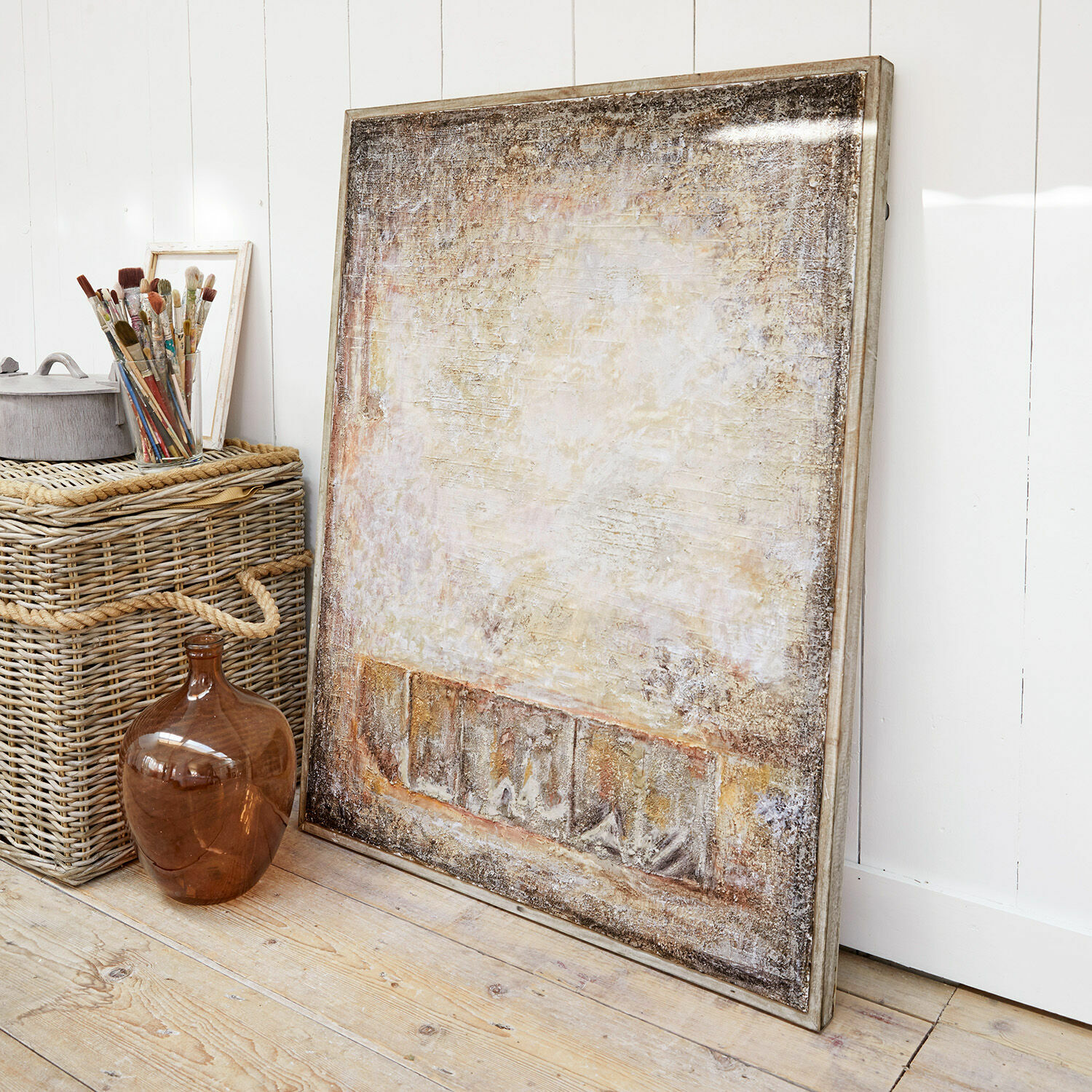 Es ist ein echtes Unikat, das auch in jeder Galerie ein Highlight wäre: Etwa zwei Tage brauchte der Maler, um dieses beeindruckende Kunstwerk zu vollenden. Von der ersten Eingebung über die Komposition der Motive und Farben bis zum letzten Pinselstrich ist dem Künstler ein Schmuckstück gelungen, das seinesgleichen sucht und Ihr Zuhause zu einem Tempel der schönen Künste macht. Betrachten Sie das Gemälde und lassen Sie Ihre Phantasie und Gedanken von ihm beflügeln und zu den fernen Ufern des Guten, Wahren und Schönen tragen. Nutzen Sie das Spiel der Farben und Formen für Ihre eigene Inspiration. Zu der faszinierenden Gestaltung gesellt sich das hochwertige Material: Die Leinwand wird von echtem, langlebigem Mangoholz stilvoll umrahmt.
