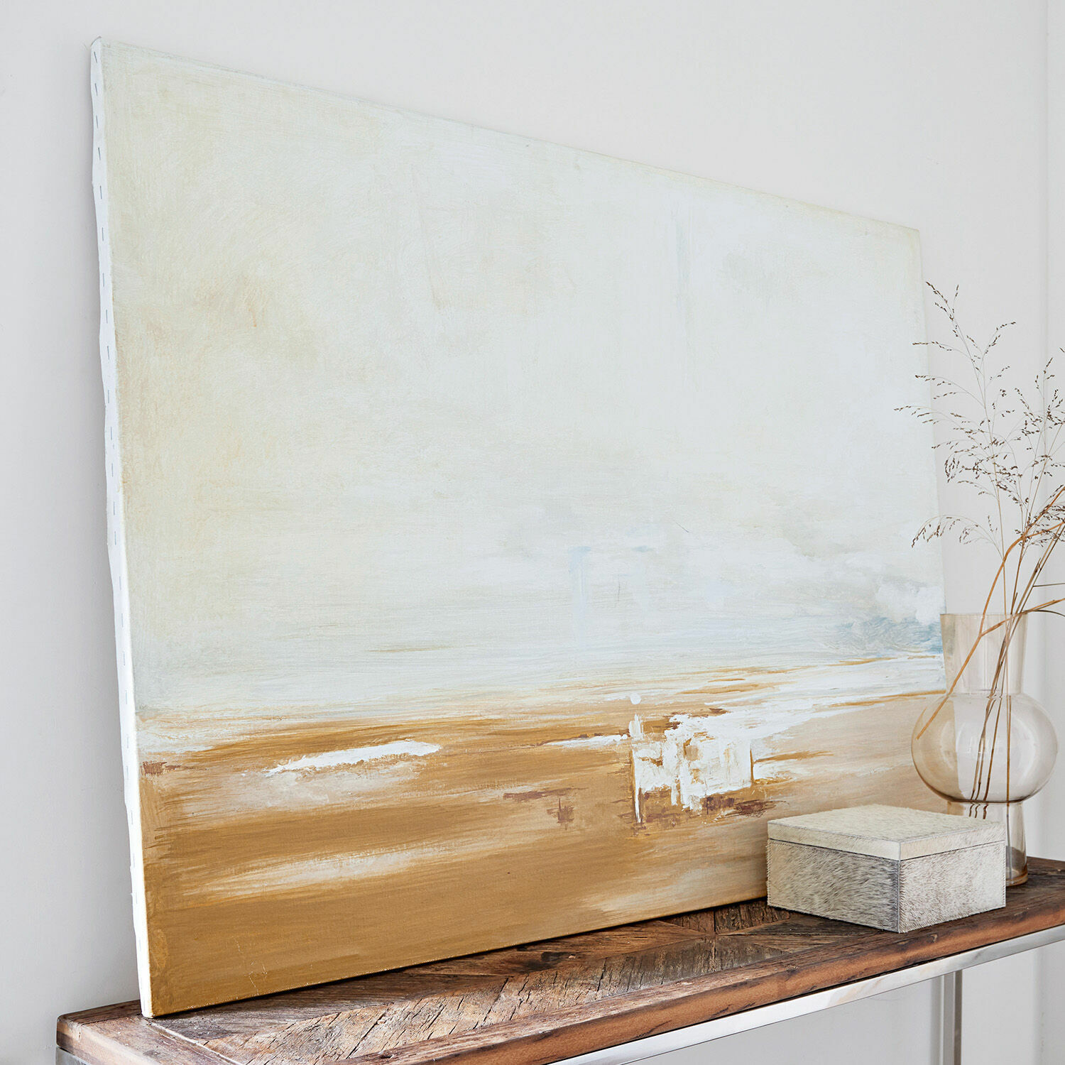 Machen Sie doch mal einen Ausflug an den Strand! Wenn der nächste Urlaub noch in weiter Ferne liegt, dann doch zumindest als kleine, wohltuende Träumerei. Das handgemalte Abbild der maritimen Naturschönheit macht es Ihnen leicht, die Gedanken abschweifen zu lassen. Eine wunderschöne Landschaft entfaltet sich da auf der großflächigen Leinwand aus Baumwoll-Canvas. Mit sanftem Pinselstrich und natürlichen Farbtönen entführt Sie der Künstler in die Weite des Ozeans. In aller Stille, vom feinen Sandstrand aus, schauen Sie aufs große Meer hinaus. Die Farbe des Wassers vermischt sich dabei fast unmerklich mit dem Blau des Himmels. Mit dem faszinierenden Gemälde beschenken Sie sich oder Ihre Lieben mit einer malerisch schönen Auszeit vom Alltag.