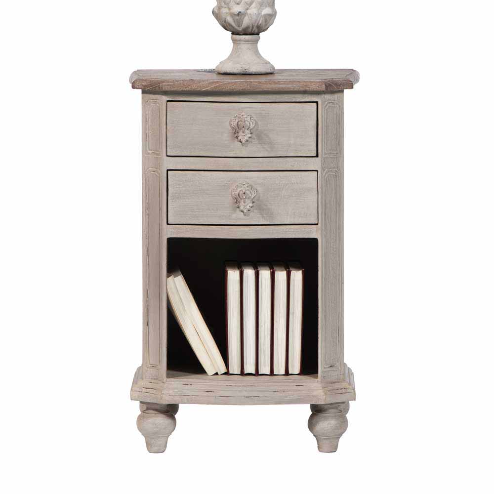 – Nachttisch Cremefarben und Naturfarben – Nachtschrank Mindiholz und MDF – Kommode Vintage – Nachtschränkchen Breite: 40 – Nachtkonsole Höhe: 65 – Beistellschrank Tiefe: 30 – Nachttischschrank Mit zwei Schubladen und mit Holzauszug – Nachtkästchen Ohne Beleuchtung – Nachtkommode Fertig montierte Anlieferung (eventuell müssen noch Kleinteile angebracht werden) – Nachttischschränkchen 4-Fuß Gestell aus Massivholz – Nachttischchen Massivholz Oberfläche, Lackiert und Antik Finish – Nachttisch kommode Metallgriffen – Nachttisch schrank Rechteckige Form – Bettkommode Griff Form: Ringgriff