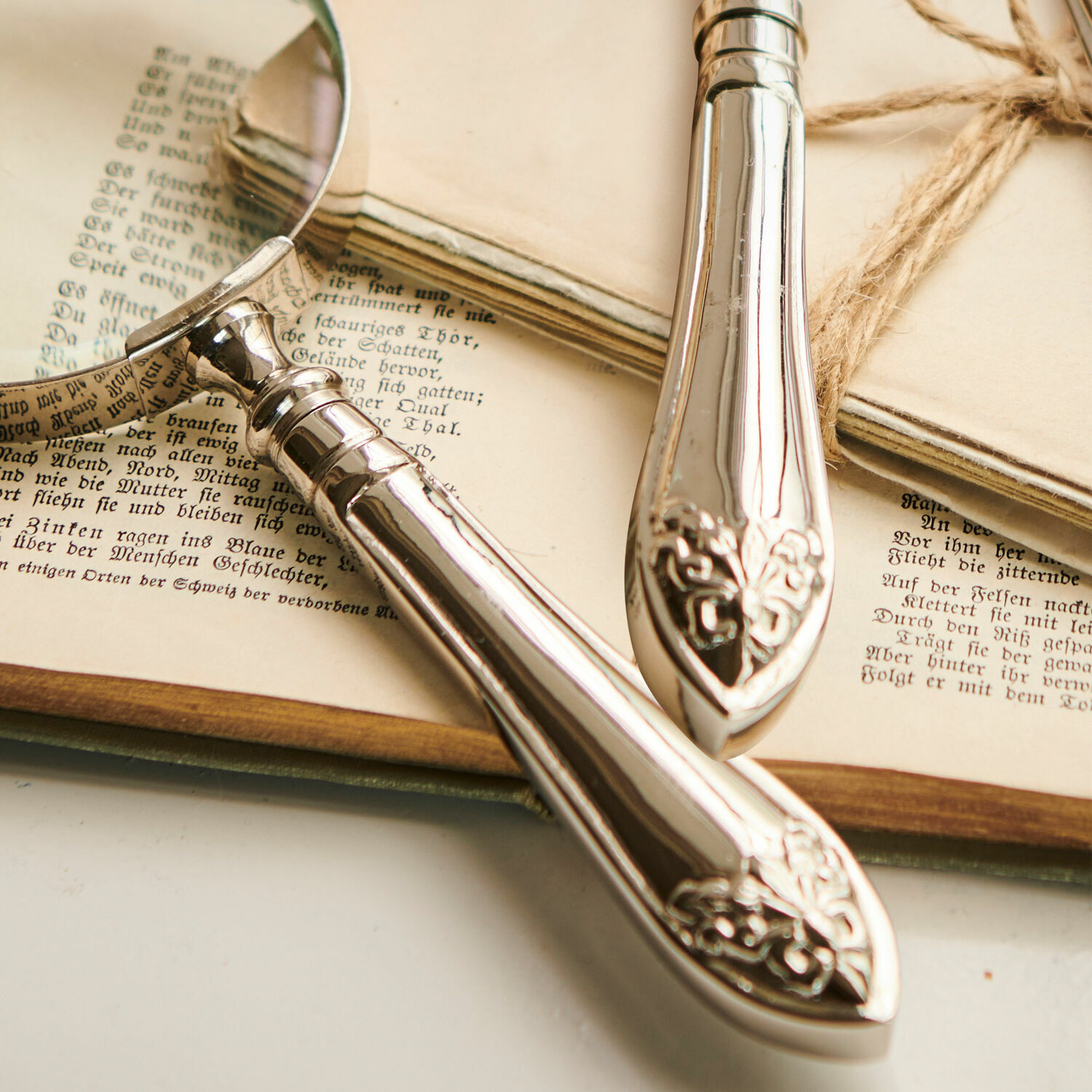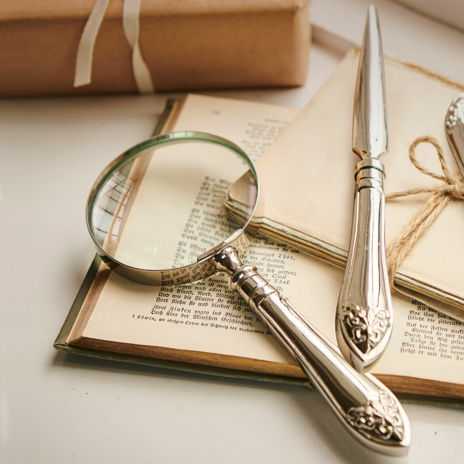 Perfektion in Form und Funktion: Dieses Paar überzeugt nicht nur durch seinen schicken Antik-Look, sondern auch durch seinen praktikablen Gebrauch. Mit diesem schmuckvollen Ensemble geben Sie Ihrem Schreibtisch das gewisse Etwas und sorgen für die feinen dekorativen Akzente, die Ihr Wohnambiente perfekt machen. Die stilvoll verzierten Oberflächen und das hochwertige Material des Duos sorgen wortwörtlich für Eleganz in doppelter Hinsicht. Bestimmt werden Sie sich täglich freuen, wenn Sie zum Öffnen Ihrer Briefe zu Ihrem hübsch verzierten Brieföffner greifen können. Aber auch den Griff zur Lupe werden Sie bald nicht mehr missen wollen. Denn vielleicht begeistern Sie sich für Briefmarken, alte Schriftstücke, Insekten oder Münzen, deren Details Sie gerne mit einem Blick durch das Vergrößerungsglas erforschen möchten.