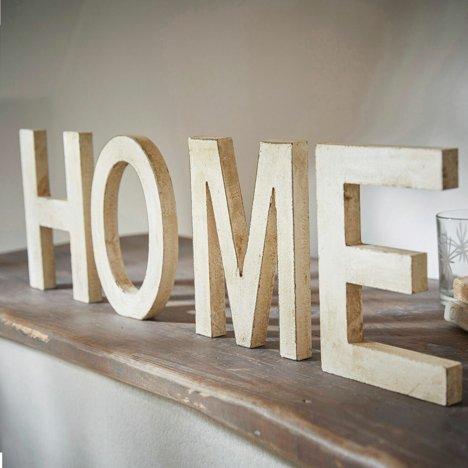 Eine sehr dekorative Liebeserklärung an Ihr Heim – der englische Schriftzug Home zeigt, dass Sie hier gerne zu Hause sind. Die hölzernen Lettern lassen sich ganz kreativ arrangieren und an jedem gewünschten Ort platzieren, zum Beispiel auf einer Treppe, am Eingang, auf einer Konsole oder im Regal aufgestellt. Auch eine Kaminkonsole oder die Fensterbank freuen sich über diesen charmanten Akzent, welcher wunderbar zum Landhaus-Stil aussieht. Verleihen Sie Ihren Räumen hiermit eine besonders heimelige Note und genießen Sie das angenehme Gefühl, den perfekten Ort zum Leben gefunden zu haben. Das attraktive Accessoire ist übrigens auch eine gekonnte Geschenkidee für liebe Freunde, die ein neues Zuhause gefunden haben.