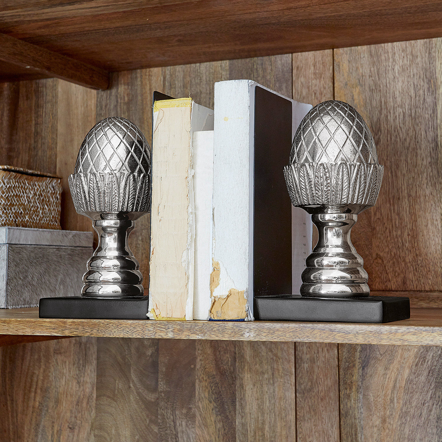 Diese eleganten Buchstützen bezaubern mit historisch inspirierten Formen aus glänzendem Aluminium und Edelstahl im Mix. Die stilisierte Zapfenform erinnert an die Antike und passt bestens zum Shabby-Chic. Die beiden stabilen Stützen bilden einen dekorativen Rahmen für Ihre Lieblingsbücher. Sie machen im Regal oder auf einer Kaminkonsole eine sehr gute Figur und adeln jedes Ambiente. Das attraktive und wertvolle Duo ist das perfekte Accessoire für alle, die Bücher lieben und auch eine gute Geschenkidee. Holen Sie sich das Flair vergangener Zeiten nach Hause und geben Sie Ihren Büchern hiermit den großen Auftritt. Funktion und Dekoration spielen hier ideal zusammen.