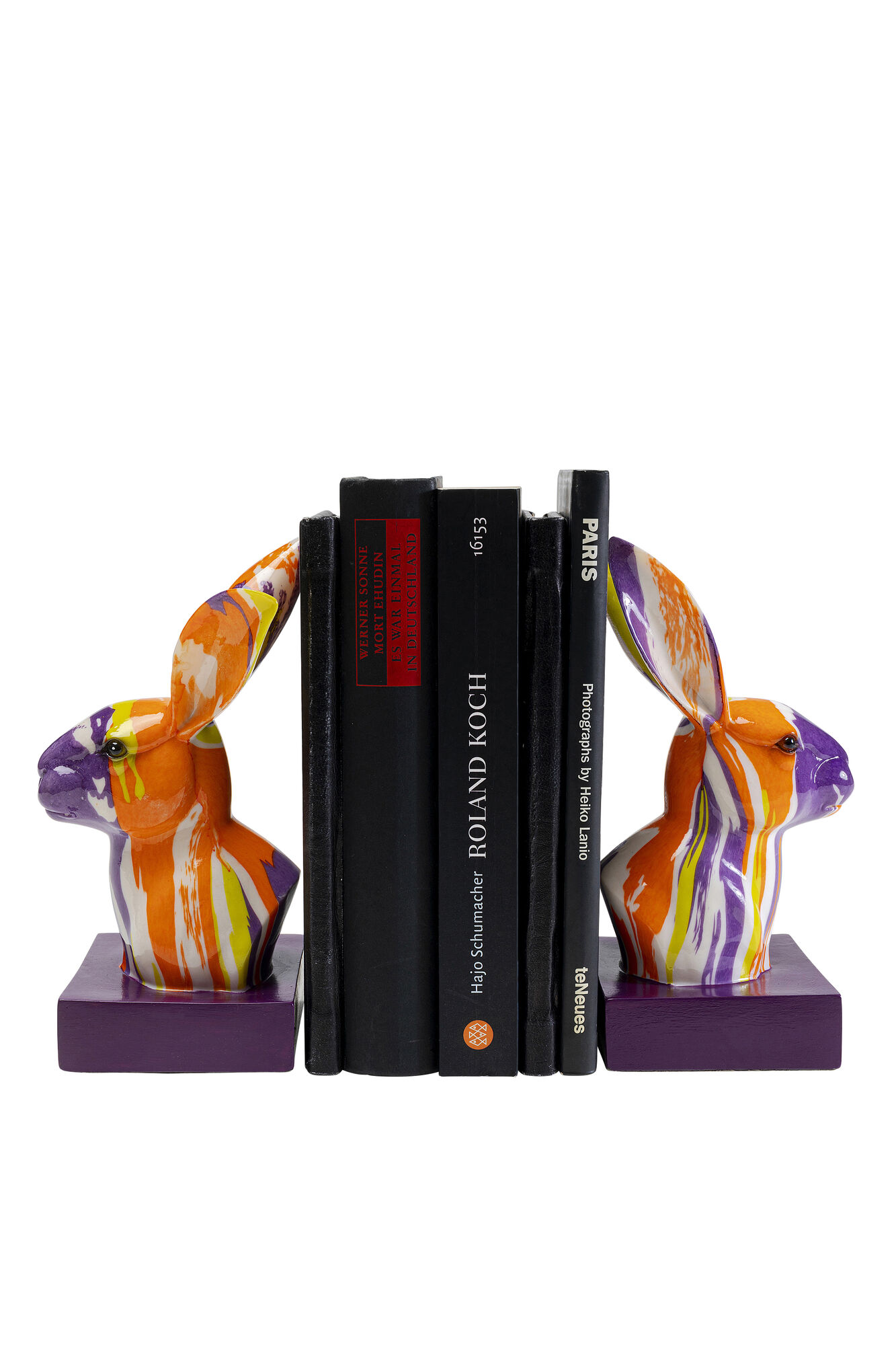 Die Hasen-Buchstützen in leuchtendem Violett und Orange kombiniert Niedlichkeit mit Funktionalität. Die lebhaften Farben und verspielte Form machen sie zu einem echten Blickfang in jedem Bücherregal. Handgefertigt mit Liebe zum Detail ist jedes Set eine einzigartige Wohndekoration, die sowohl dekorativ als auch nützlich ist. Ein charmantes Accessoire, das Ihre Bücher stilvoll in Szene setzt und für Farbe sorgt. Material: (Objekt: Polyresin, Sockel: Naturstein Zement)