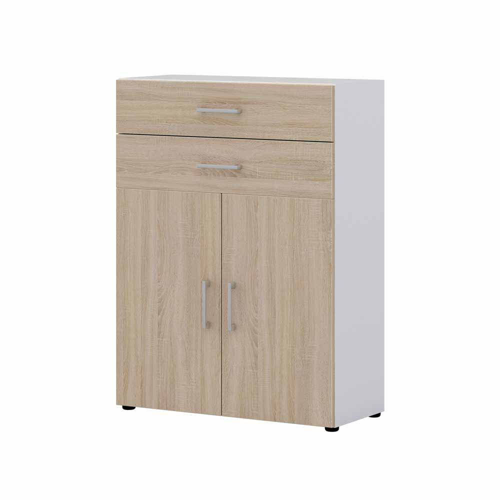 – Kommode Weiß und Sonoma-Eiche – Vertiko Spanplatte – Flurkommode Modern – Hochkommode Breite: 80 – Küchenkommode Höhe: 107 – Wohnzimmer kommode Tiefe: 34 – Vertiko schrank Mit zwei Schubladen, mit Metallauszug und Vollauszug – Hohe kommode Schrank-Tür: mit Drehtüren – Flur kommoden 2-türig, Innenaufteilung: mit Einlegeböden – Säulenkommode Ohne Beleuchtung – Wohnzimmerkommode Zerlegt, zum leichten Selbstaufbau (Montageanleitung liegt bei) – Vertiko kommode Deutsche Produktion – Garderobenkommode Melaminbeschichtet – Kommode für garderobe Metallgriffen – Mit stoßfesten ABS Kanten – Rechteckige Form – Holzwerkstoff TürInformationen zur Lieferung:Die Zustellung dieses Produktes erfolgt per Spedition. Sie werden vor der Auslieferung durch die ausliefernde Spedition kontaktiert.Terminvereinbarung: Sie werden frühzeitig (ein paar Tage im Voraus) durch die ausliefernde Spedition kontaktiert und Ihnen der Auslieferzeitpunkt mitgeteilt. Die Kontaktaufnahme erfolgt per Telefon. Bei telefonischer Nichterreichbarkeit werden Sie per Postkarte über das Auslieferdatum informiert.Die Lieferung erfolgt aus Kostengründen Frei Bordsteinkante (bis zur ersten verschlossenen Tür). Für den weiteren Transport der Ware sind Sie eigenverantwortlich.Die Auslieferung erfolgt von Montags bis Freitags. Eine Zustellung an Sonn- und Feiertagen ist nicht möglich.