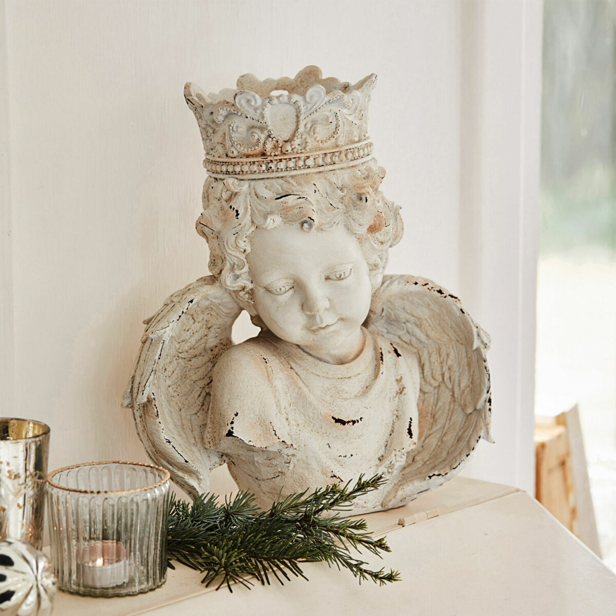 Man muss nicht an Engel glauben, um sich in diese Büste zu verlieben. Schließlich handelt es sich bei dieser Skulptur um ein Paradebeispiel für hochwertiges Kunsthandwerk. Die aus Kunststein handgefertigte Engelsbüste verleiht jedem Eingangsbereich, Garten oder Salon einen Hauch von Positivität und Spiritualität. Das authentische Antik-Design orientiert sich an jahrhundertealten Museumsexponaten, die heute unbezahlbar wären. Erfahrene Künstler haben ein täuschend echtes Vintage-Flair geschaffen, indem sie die Oberfläche in mehreren Schritten veredelten. Die Büste ist nicht nur handgearbeitet, sondern auch handbemalt. Die aufwendig gearbeiteten Alterungsspuren und viele raffinierte Details machen jedes Stück zu einem Unikat.