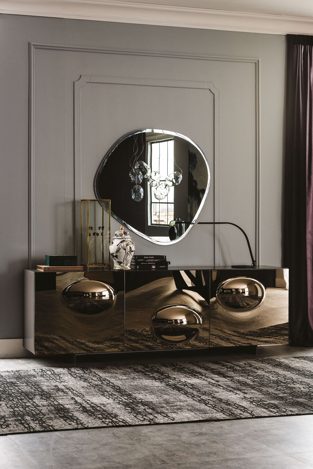 Paramount ist Ausdruck eines forschen, aber raffinierten Designs. Die Türen, die der Struktur Charakter und Rhythmus verleihen, sind dank geschickter Herstellungstechniken aus konvexem Kristall gefertigt. Paramount ist ein modernes Sideboard, das in verschiedenen Ausführungen erhältlich ist, matt oder glänzend, wobei letzteres die Umgebung mit einem surrealen Spiegelspiel widerspiegelt. Die edlen Materialien, aus denen die Innen- und Außenböden und der Sockel bestehen, machen deutlich, dass dieses moderne Sideboard aus Glas das Ergebnis der hohen Qualität italienischer Manufaktur ist.