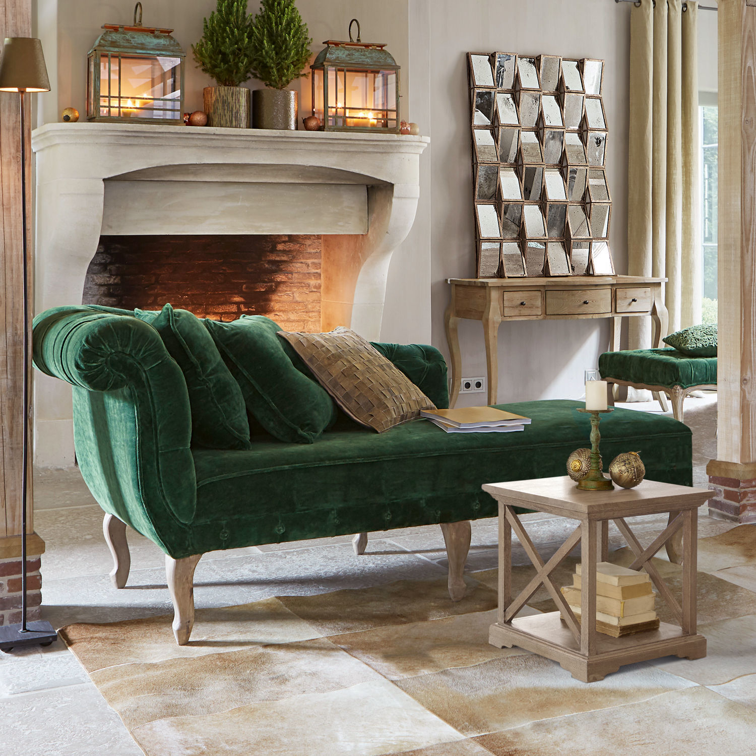Bezug aus weichem Baumwoll-Samt. Inklusive zwei edlen Deko-Kissen mit Keder und Chesterfield-Knopf. Von Hand gedrechselte Füße aus Mangoholz. Ein prachtvoller neuer […]