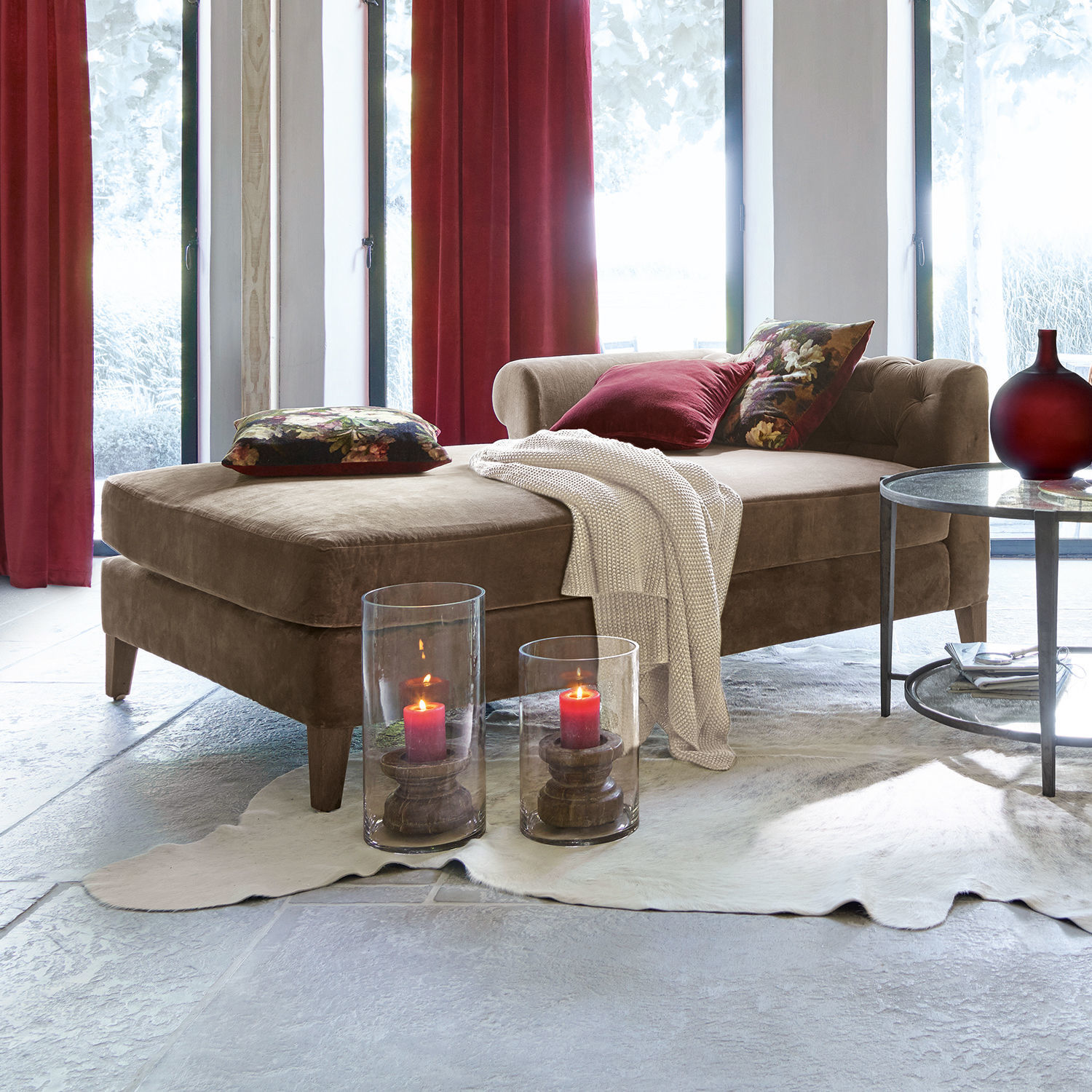 Neues Look-and-Feel für die eigenen vier Wände erwünscht? Dann wählen Sie ein Möbelstück, das sofort zum extravaganten Blickfang im Raum wird: eine Chaiselongue. Dieses Sitz- und Liegesofa trat vor ungefähr 200 Jahren seinen Siegeszug in die eleganten Salons an, als sich die wohlhabende Salonniere Julie Récamier auf ihm malen ließ. Geriet die Chaiselongue im letzten Jahrhundert etwas aus dem Blickfeld, ist sie im Moment wieder groß im Kommen, denn die Kombination aus klassischer Eleganz mit modernen Liegekomfort passt einfach perfekt zum zeitgemäßen Wohn- und Lebensstil. Dieses Modell orientiert sich stolz an den historischen Vorbildern, wie die traditionelle Form mit nur an einer einzigen Seitenlehne augenfällig demonstriert, die so verführerisch zum Hineinkuscheln einlädt. Klassisch ist auch die typische Chesterfieldsteppung an der Rücken- und Seitenlehne ebenso wie der Bezugsstoff aus edlem Baumwollsamt, der sanft schimmert und mit einer schmeichelweichen Haptik verwöhnt. Schlicht geformt, aber aus hochwertigem Mangoholz gefertigt sind der stabile Rahmen und die Füße. die hochwertige Polsterung macht den Komfort der Chaiselongue schließlich perfekt. Wo dieses exquisite Möbelstück am besten steht? In kleineren Räumen ist sie die platzsparende Alternative zu einem normalen Sofa, im großzügigen Wohnbereich ergänzt sie andere Sitzmöbel. Und haben Sie eine leere Zimmerecke, wird diese mit der Chaiselongue, Beistelltisch und Lampe zu einem gemütlichen Rückzugsort zum Lesen und Musikhören.