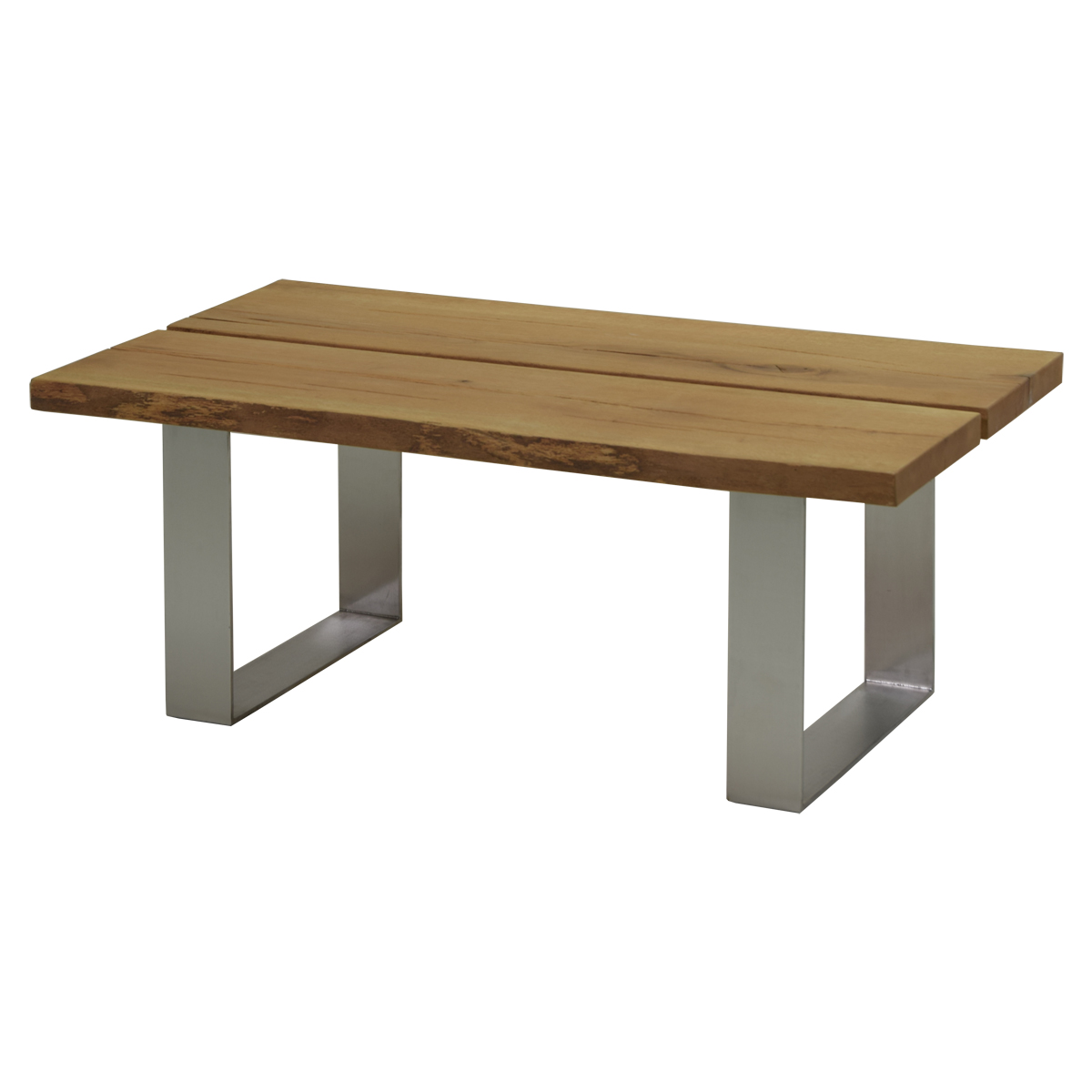 Couchtisch aus Eiche mit geteilter Tischplatte und Metallgestell in U-Form.
