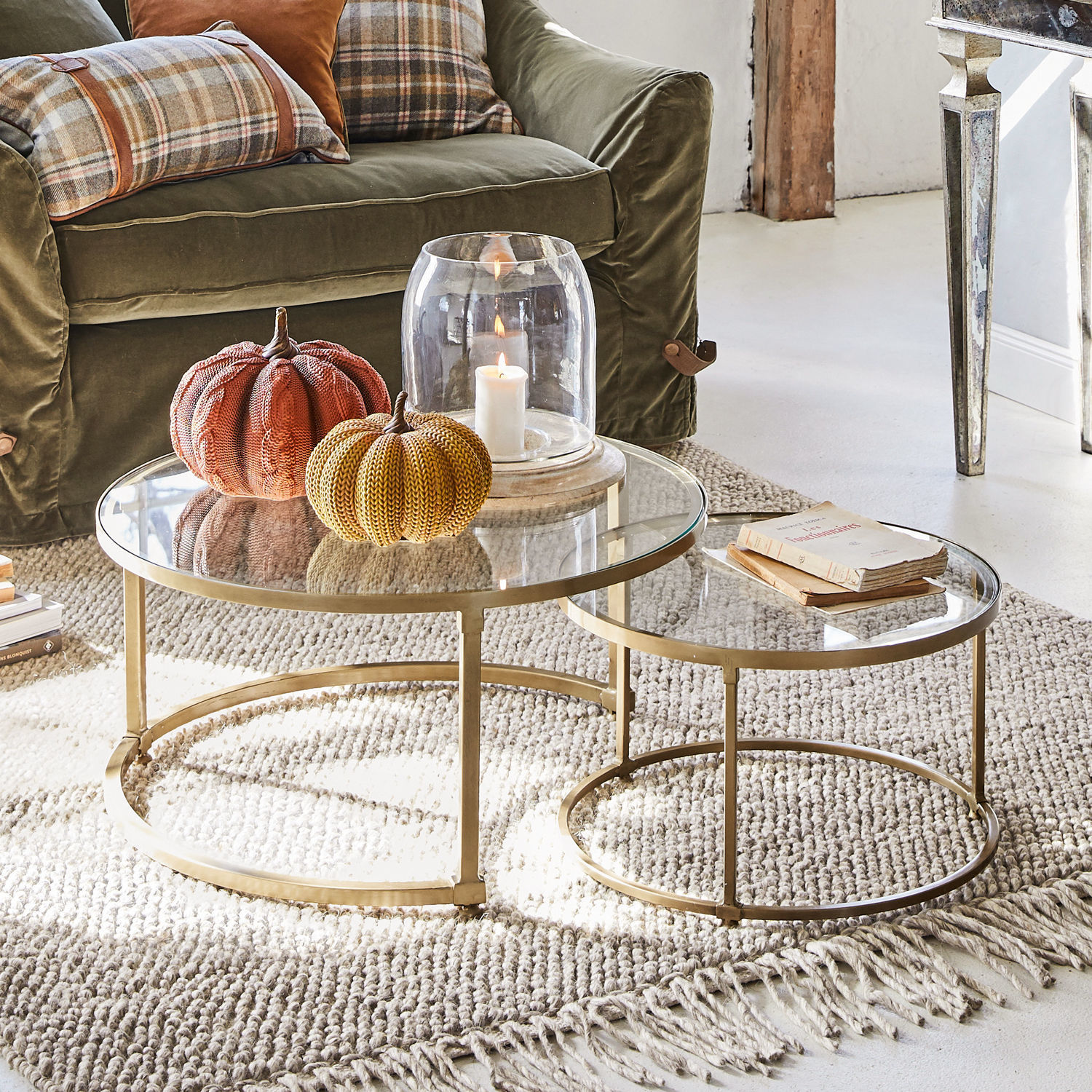 Besonders smart: Durch das ineinander schiebbare Design erhalten Sie ganz nach Wunsch einen oder zwei Tische, die Sie ganz flexibel einsetzen und platzieren können – sehr gut auch für kleinere Räume geeignet. Die beiden perfekt ineinander eingepassten und sehr stilvollen Modelle in zwei Größen aus Eisen und Glas bezaubern mit nostalgischer Optik und angenehmer Formgebung. Klassische Eleganz und zeitloser Stil ziehen mit diesem gekonnten Design ein. Die runden Formen strahlen eine besondere Harmonie aus und fügen sich wunderbar in jedes Ambiente ein. Schmücken Sie die Glasplatte doch mit einem Blumenstrauß oder Kerzen und freuen Sie sich über eine geschmackvolle Ergänzung zu Ihrer Couch. Doch auch an anderer Stelle als Beistelltische eingesetzt, lassen sich damit dekorative Effekte erreichen. Ein langlebiger Look, der nicht aus der Mode kommt und mit der nostalgischen Messing-Optik hervorragend zum Industrial-Stil passt.