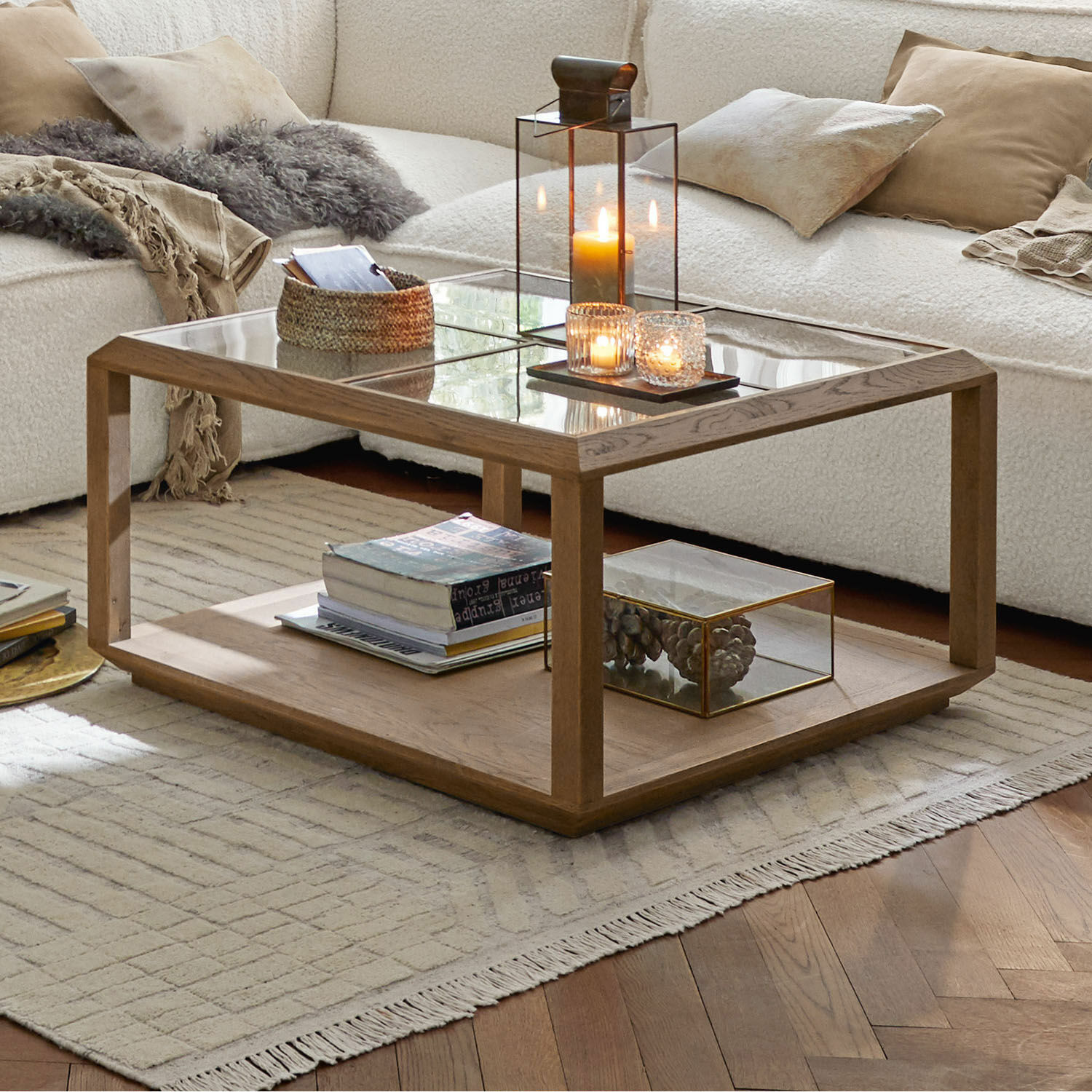 Bereit für eine gesellige Runde oder einen gemütlichen Fernsehabend: Ob Sekt oder Selters, ob Smartphone oder Fernbedienung, Vase oder Kerzen – der bezaubernde Couchtisch hält alles griffbereit oder kann als Blickfang für Dekoobjekte dienen. Bringen Sie mit ihm in Ihren vier Wänden Wohnkultur der Extraklasse zum glänzen. Seine Designkunst zeigt der schicke Tisch in Form seines Vollholzrahmens, der durch Glaselemente aufgewertet wird. Das Schmuckstück besteht hauptsächlich aus Eichenholz und kann durch den Beistelltisch 21027 optimal ergänzt werden. Damit haben Sie ein Ensemble, das nicht nur mehr Ablageplatz schenkt, sondern auch bereit ist, wenn sich in Ihrem schönen Zuhause zahlreiche Gäste zusammenfinden. Durch ihr natürlich gemasertes Holz und ihre elegant abgeflachten Kanten werden die Tische immer ein Blickfang sein.