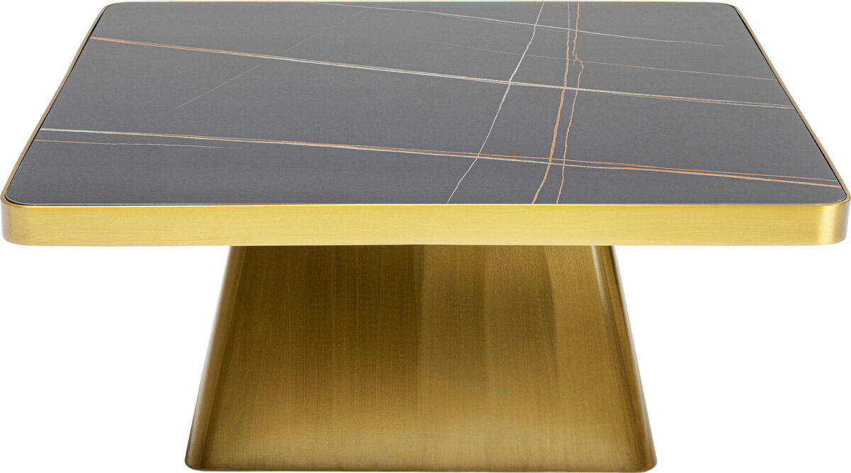 Wohnen wie bei Great Gatsby! Dieser Wohnzimmertisch versprüht jedenfalls schon die richtigen Luxus-Vibes. Die große Tischplatte aus dunklem Marmorgranulat mit wunderschöner Maserung, die an Naturstein erinnert, ergibt mit dem goldfarbenem Tischrand und Sockel ein super edles Gesamtbild. Der Sofatisch ist mit seinen Maßen von 80x36x80cm (BHT) kompakt, fällt jedoch durch sein besonderes Design direkt auf – vor allem neben einem hellen Sofa! Auch als Nachttisch im Schlafzimmer oder neben der Bar zieht der Tisch alle Blicke auf sich. Material: (Sockel: Stahl natur und galvanisiert, Mineralmarmor Tischplatte)